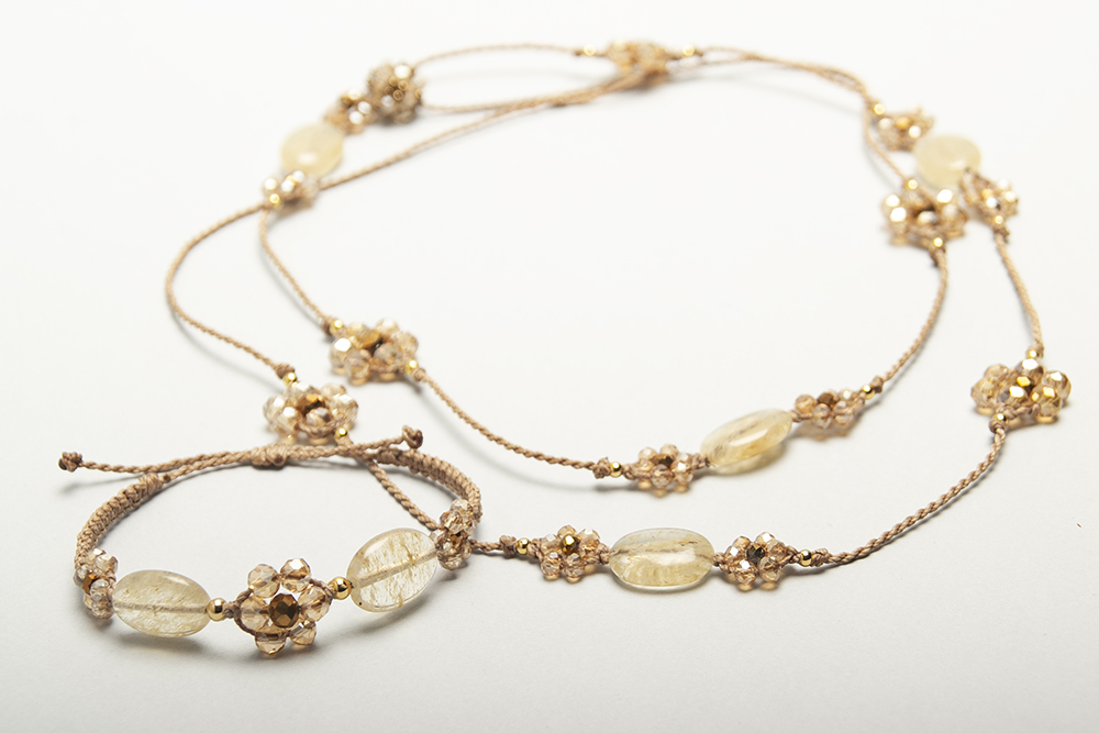 Conjunto de collar + pulsera de quarzos, cristales y bolitas de acero bañadas en oro 24 k