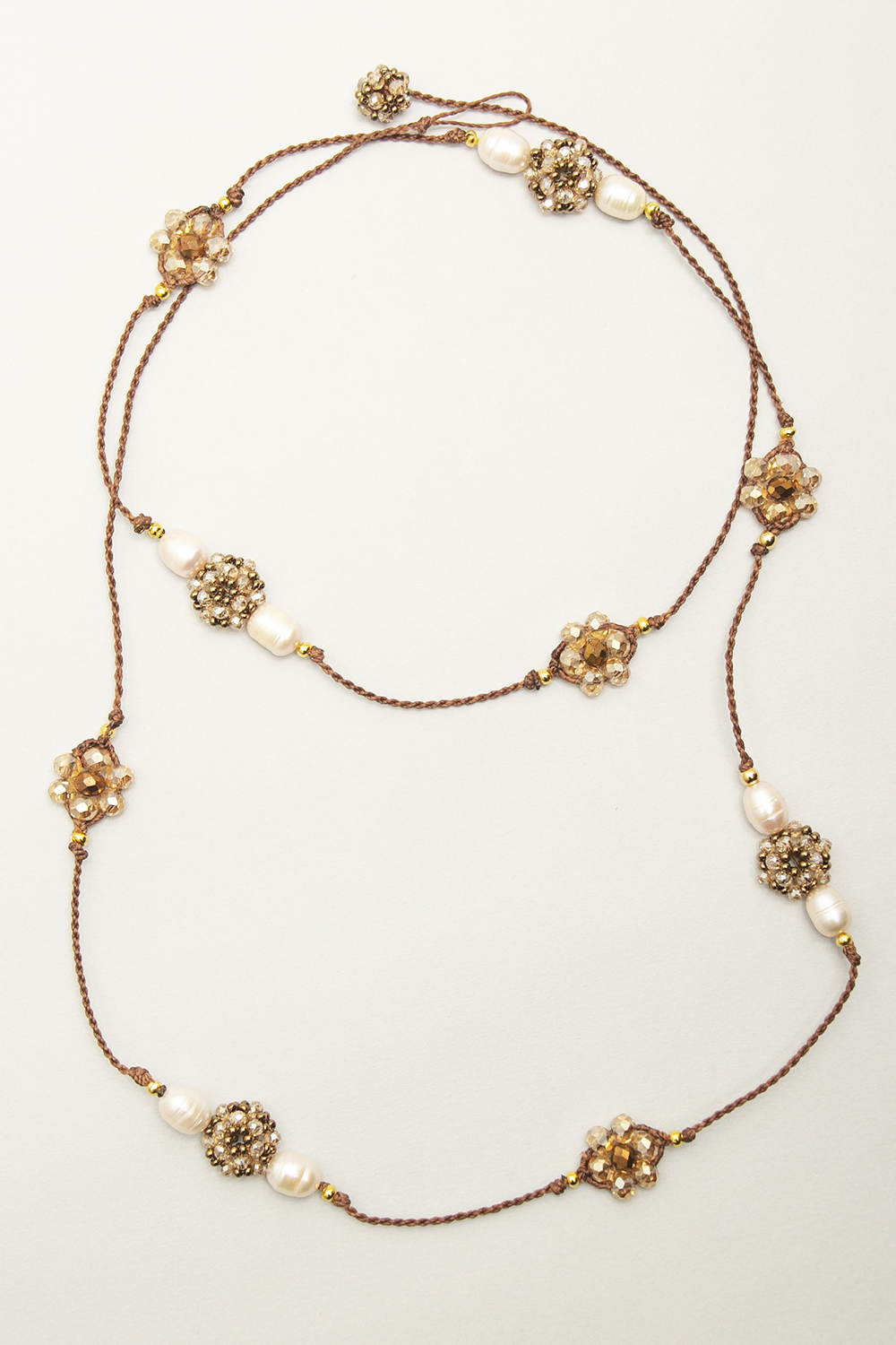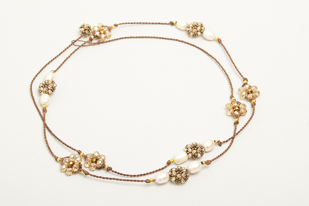 Collar tejido en macramé con hilo encerado, perlas de río, bolitas de acero bañadas en oro 24 k y cristales tejidos.