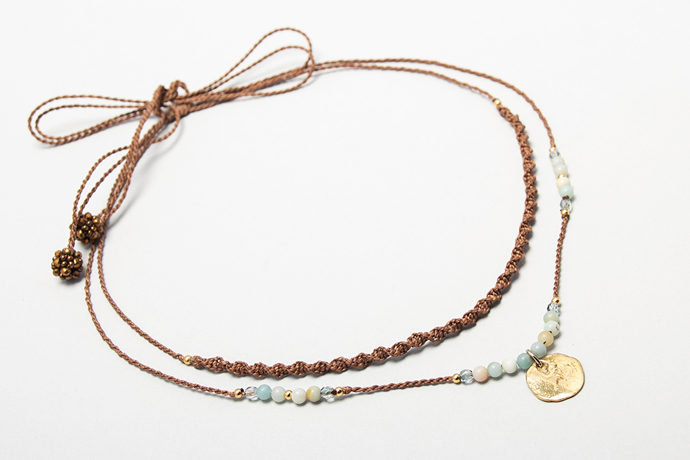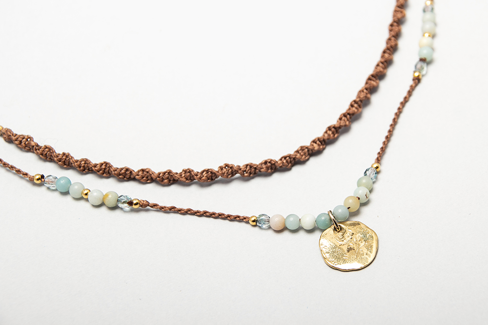Gargantilla doble hecha en macrame con amazonitas rusas, cristales checos y dije en bronce