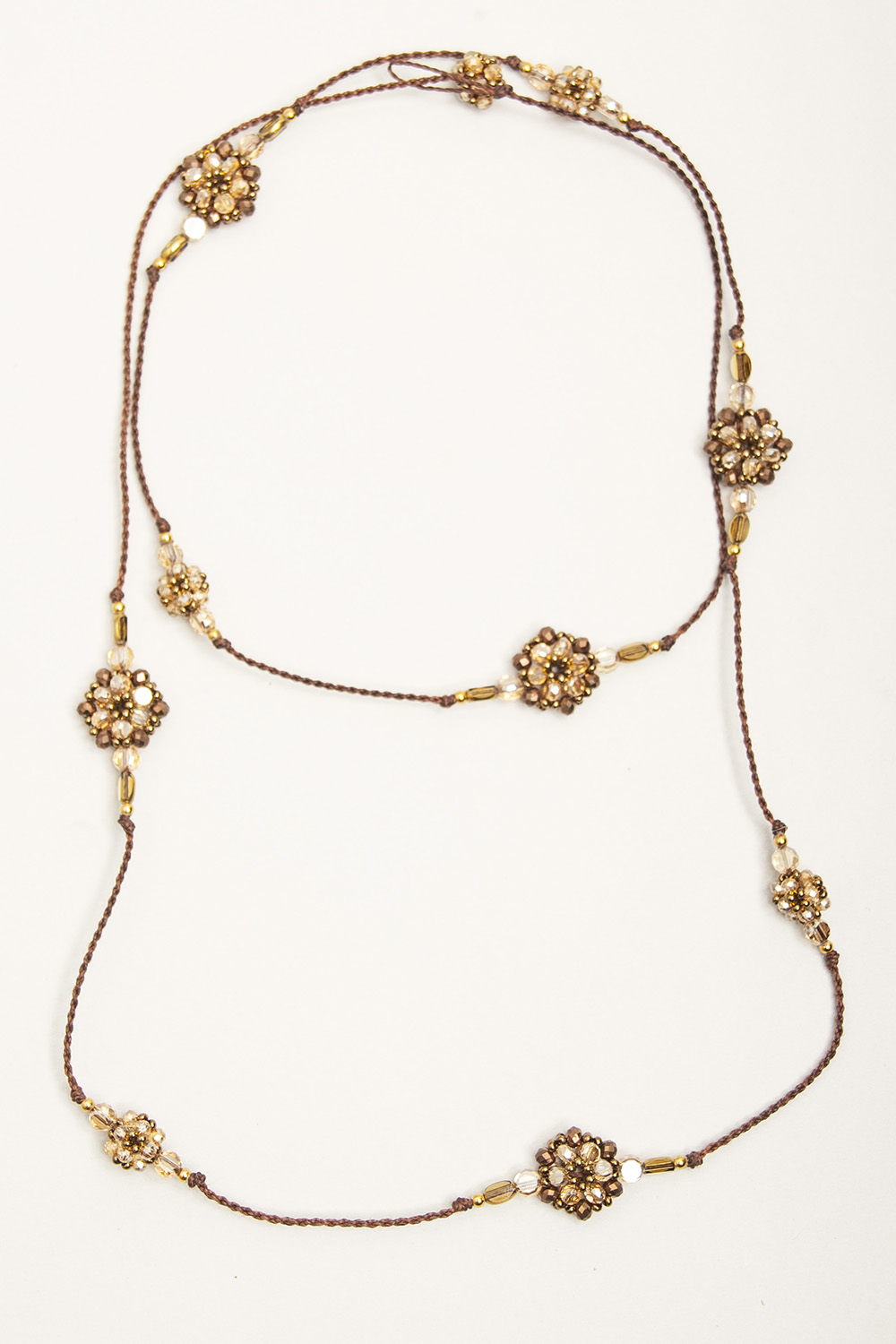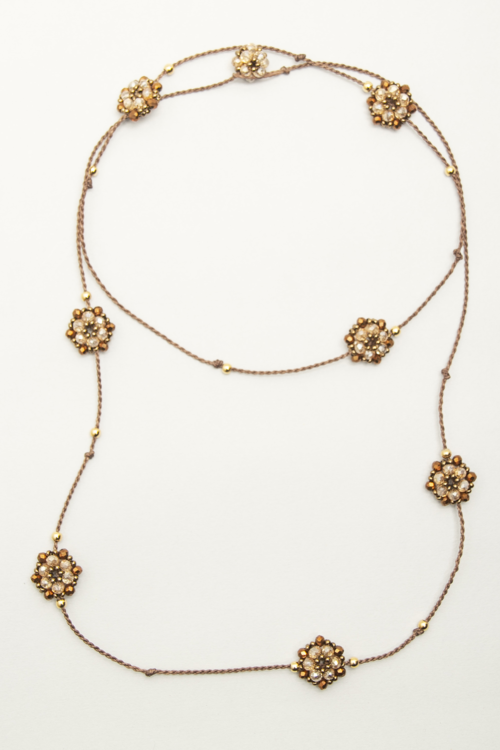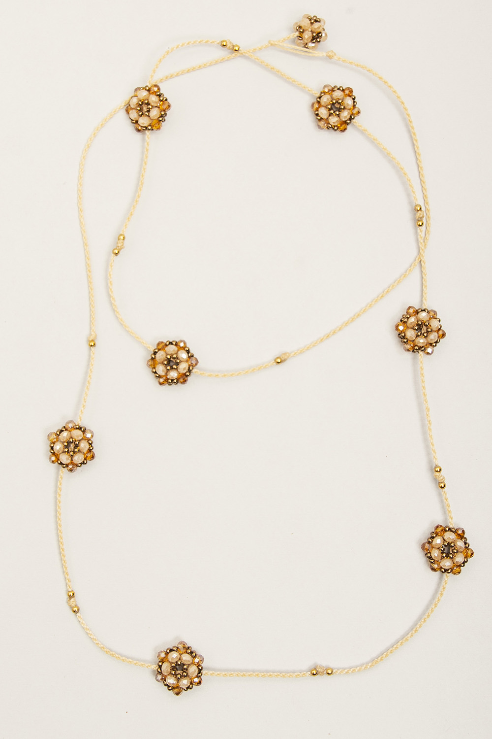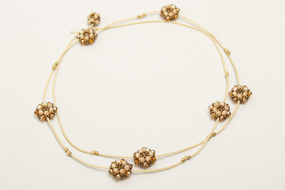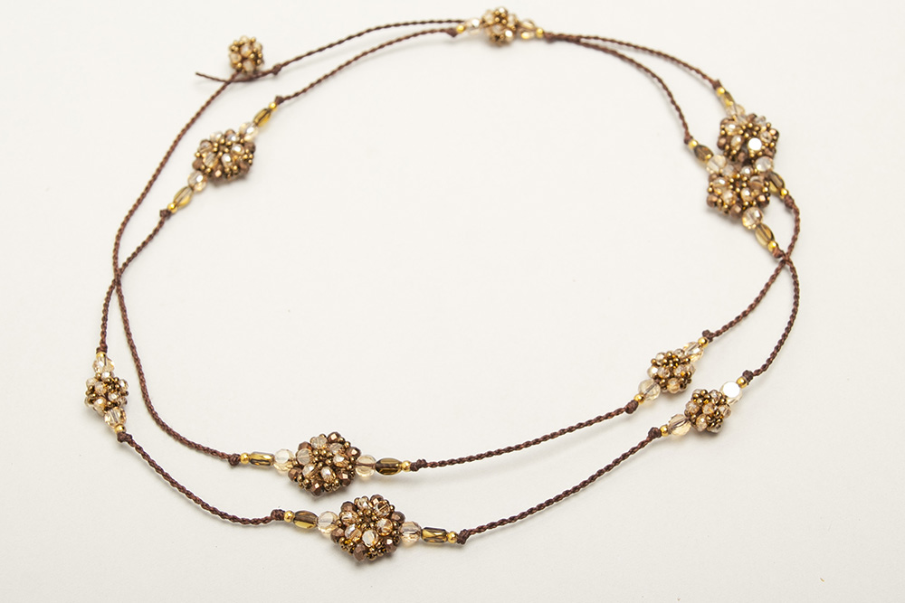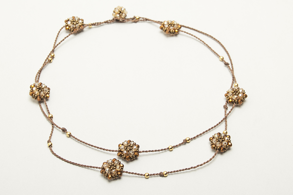 Collar tejido en macramé con hilo encerado, con bolitas de acero bañadas en 24 k y satélites tejidos con cristales y mostacillas checas.