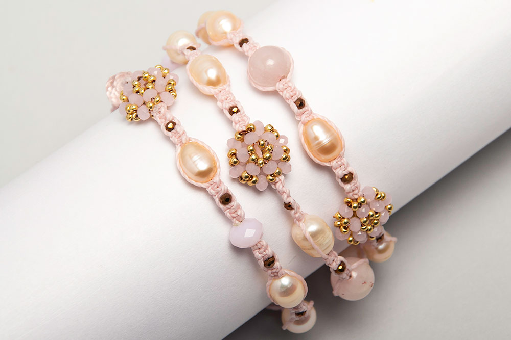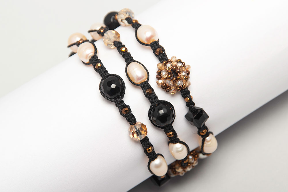 Pulsera tejida en macramé de perlas de río cultivadas, crisolares y onix