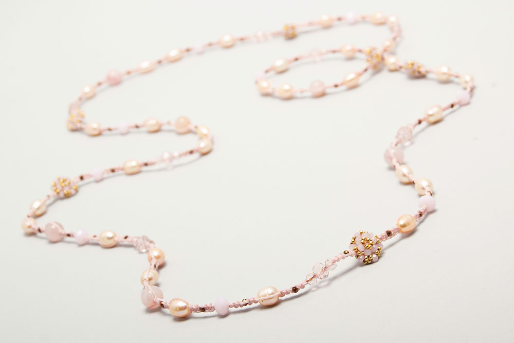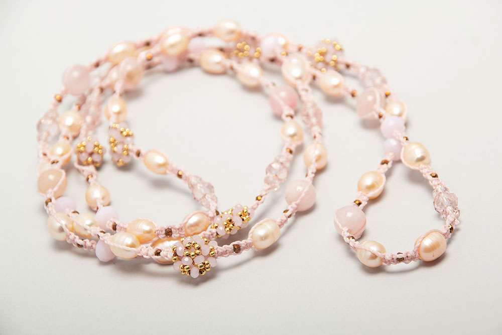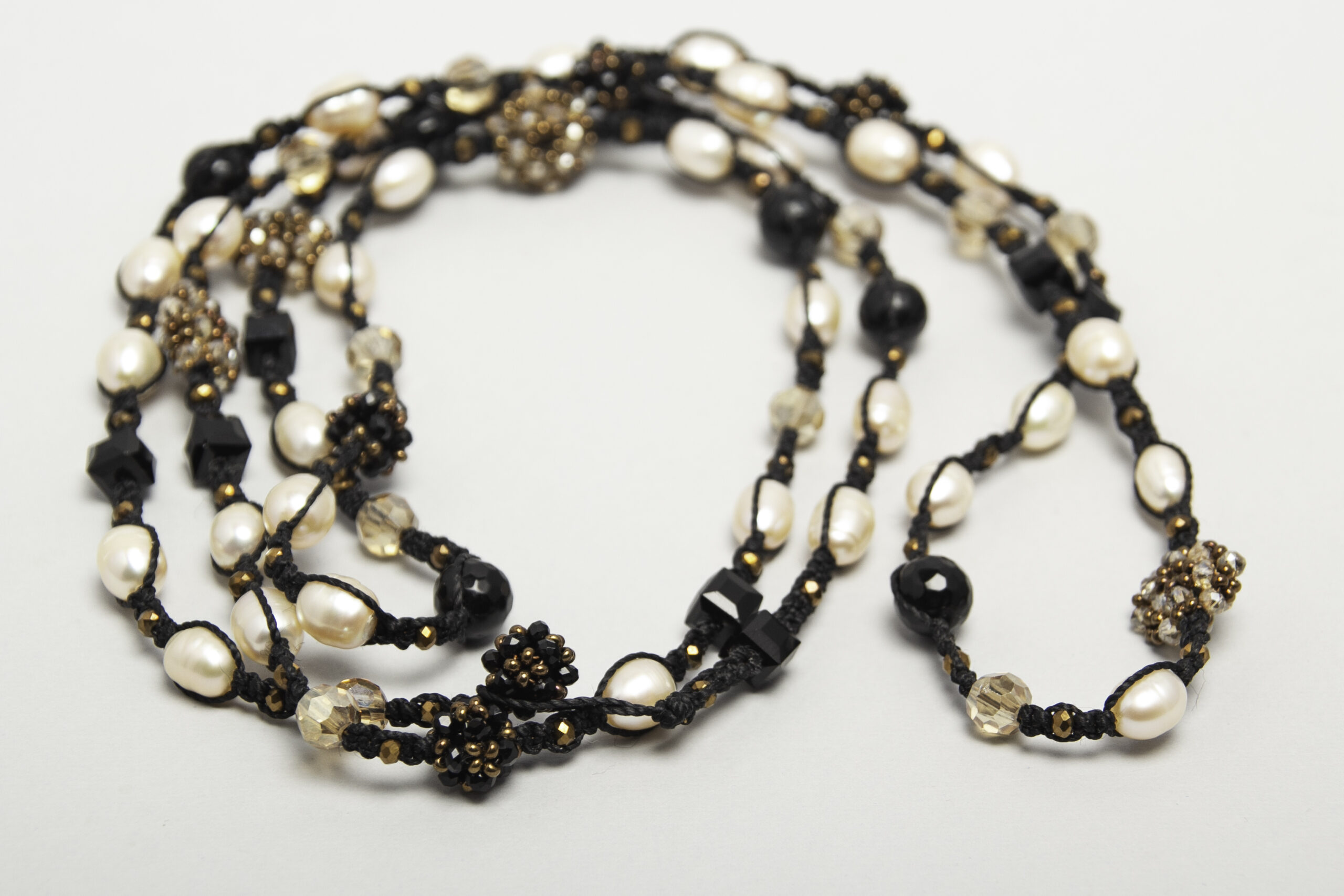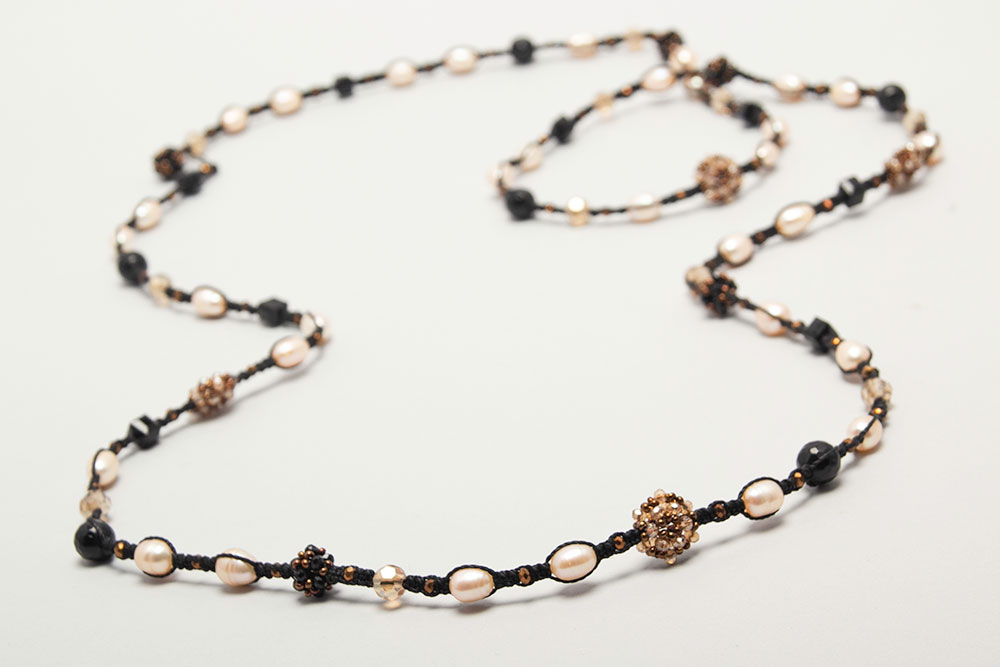 Collar largo tejido en macramé en hilo encerado con perlas de río cultivadas, cristales y onix