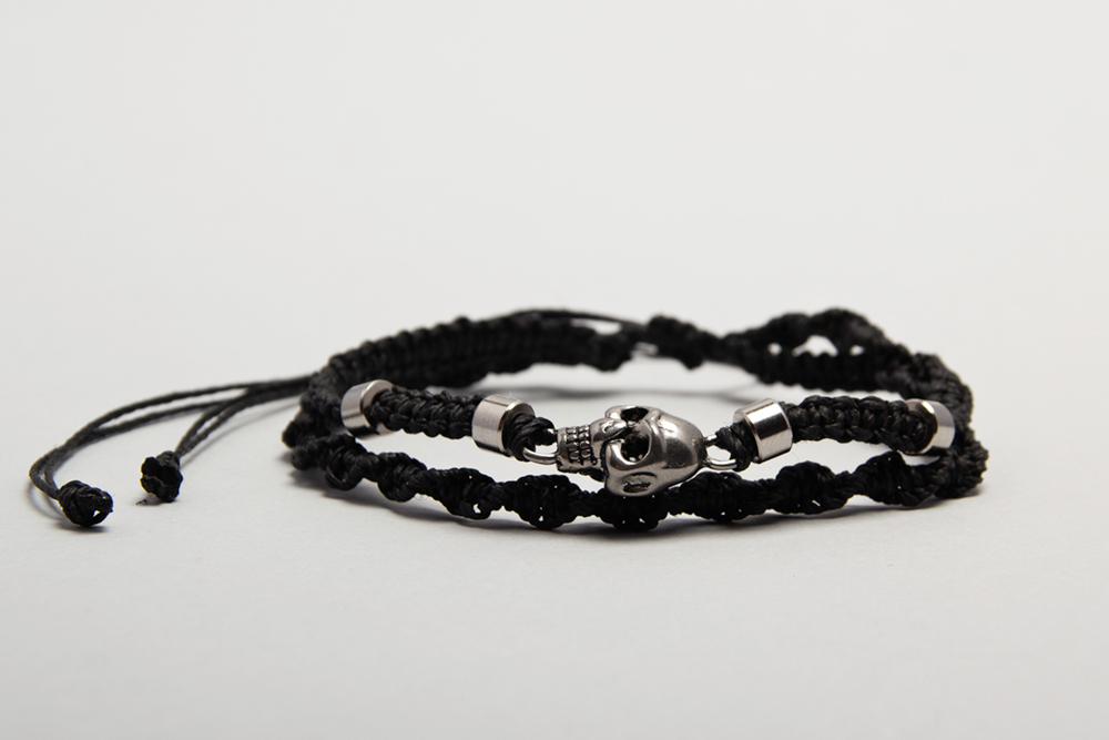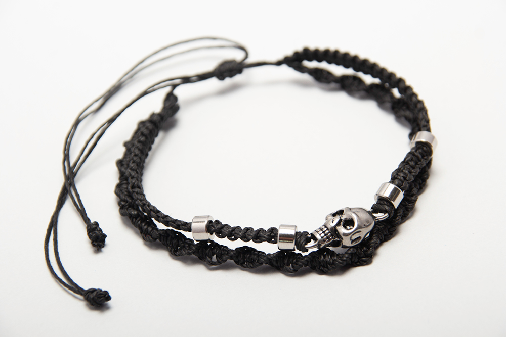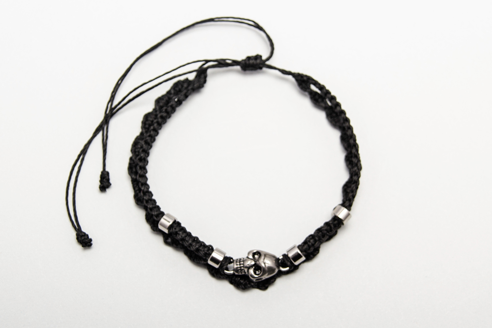 Pulsera en hilo con técnica en macramé doble con una calavera en acero quirurgico y terminaciones en el mismo material