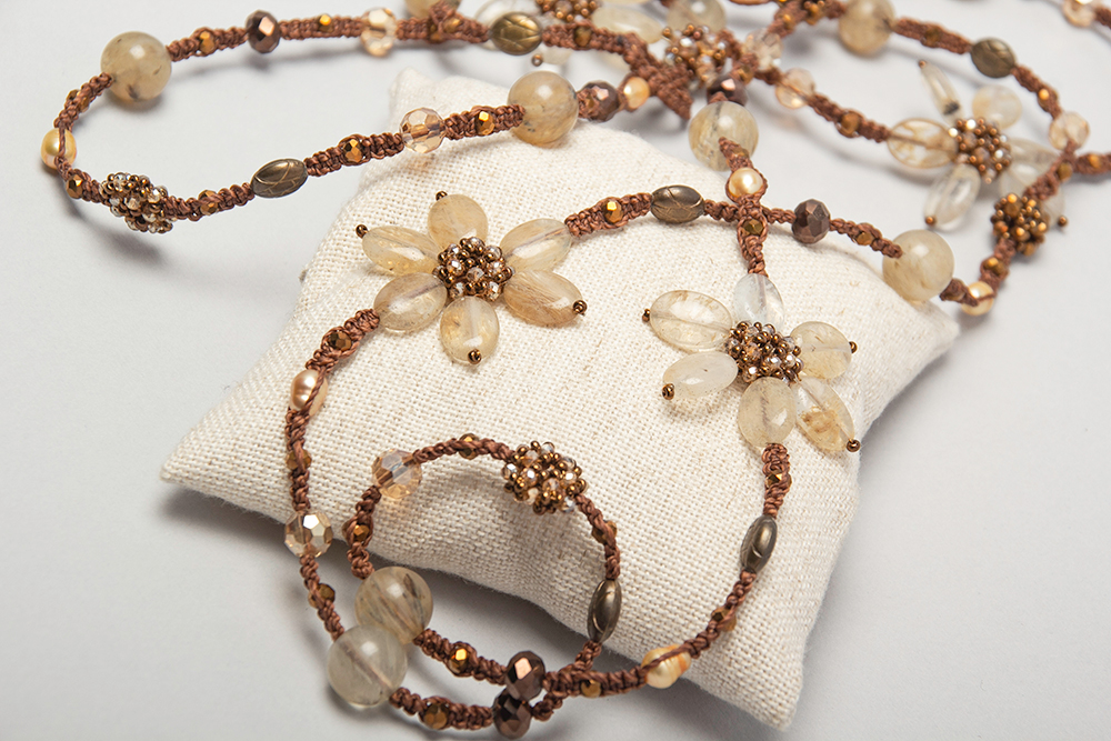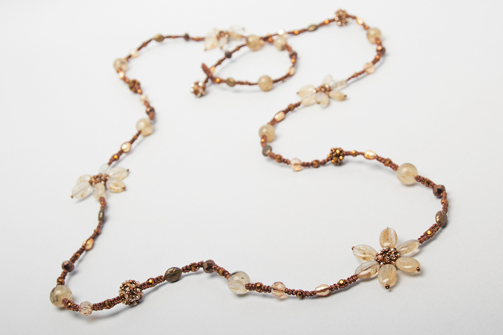 Collar largo (permite doble vuelta) en hilo encerado tejido en macrame con flores en quarzos, perlas de rio, cristales y detalles de terminaciones con cristales tejidos.