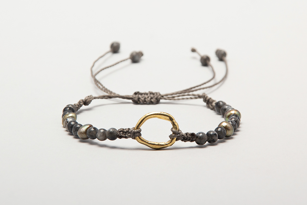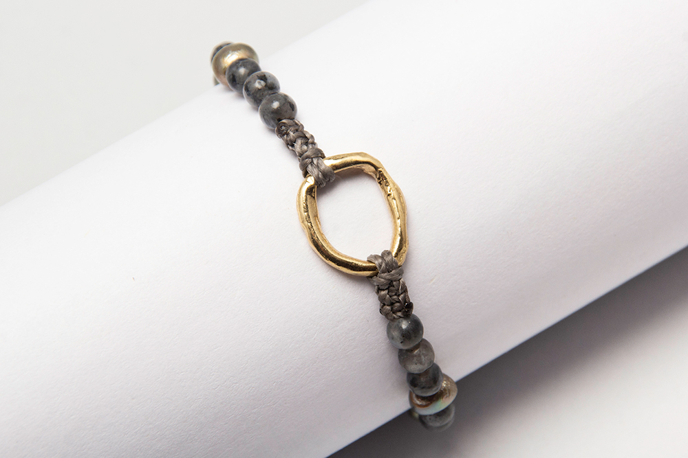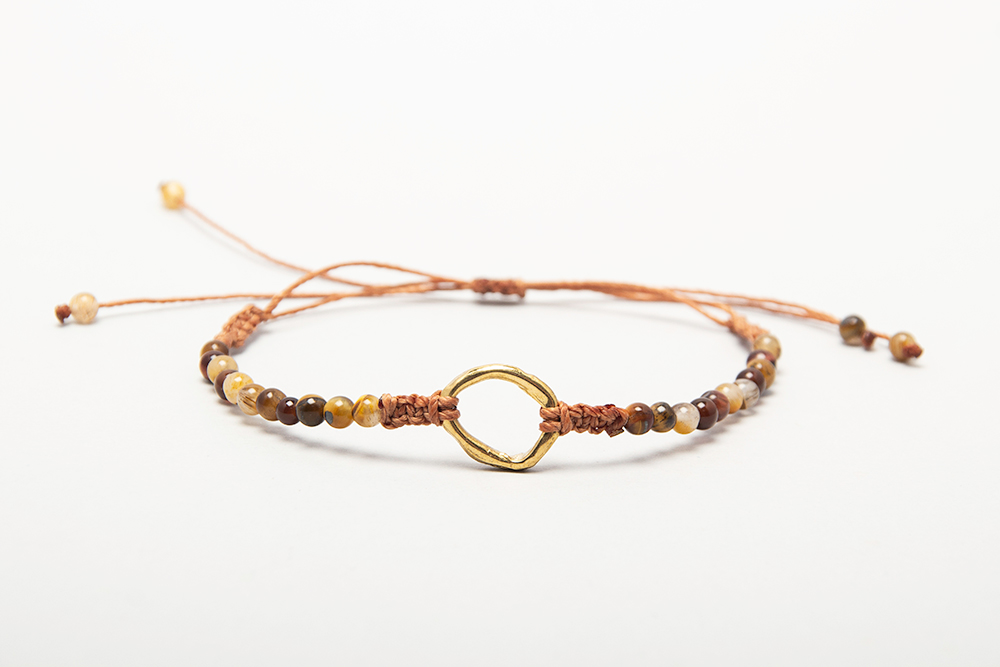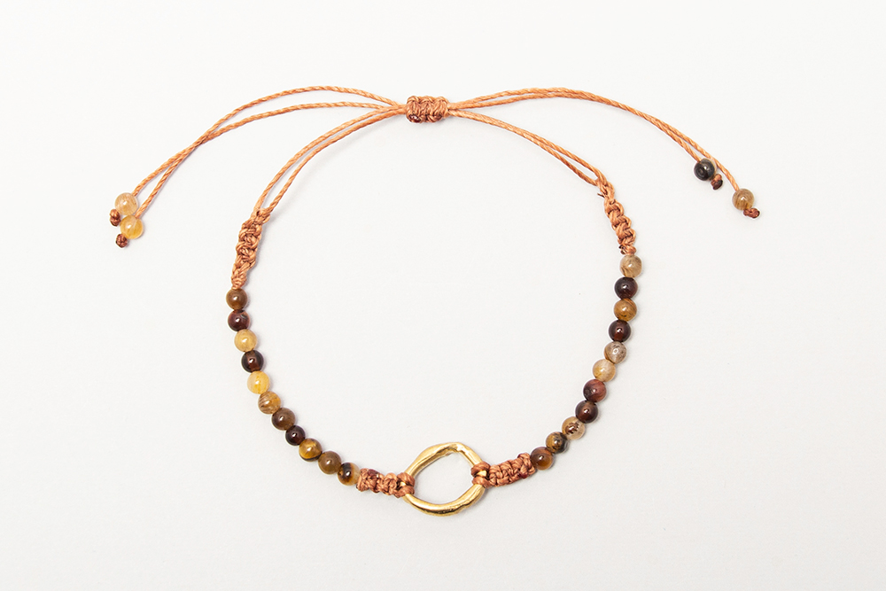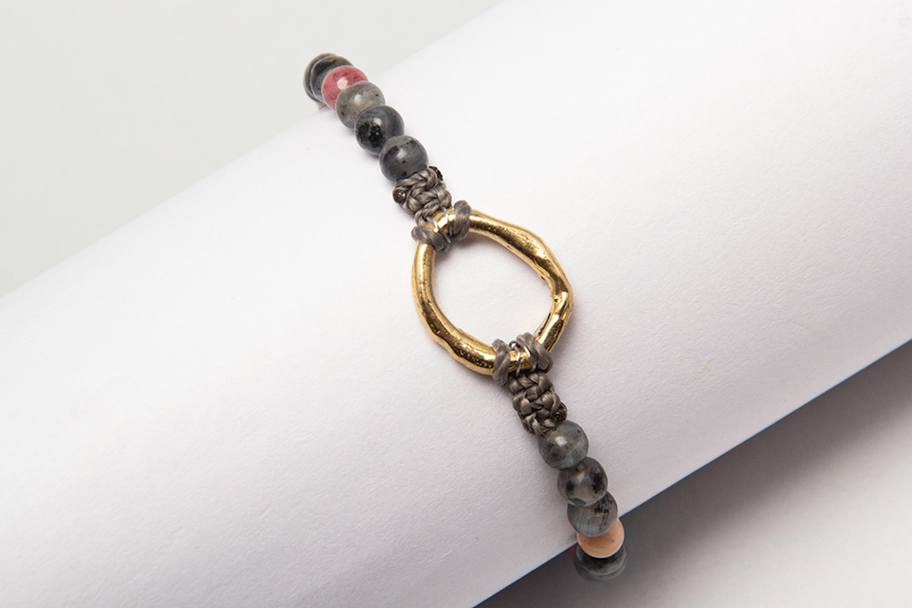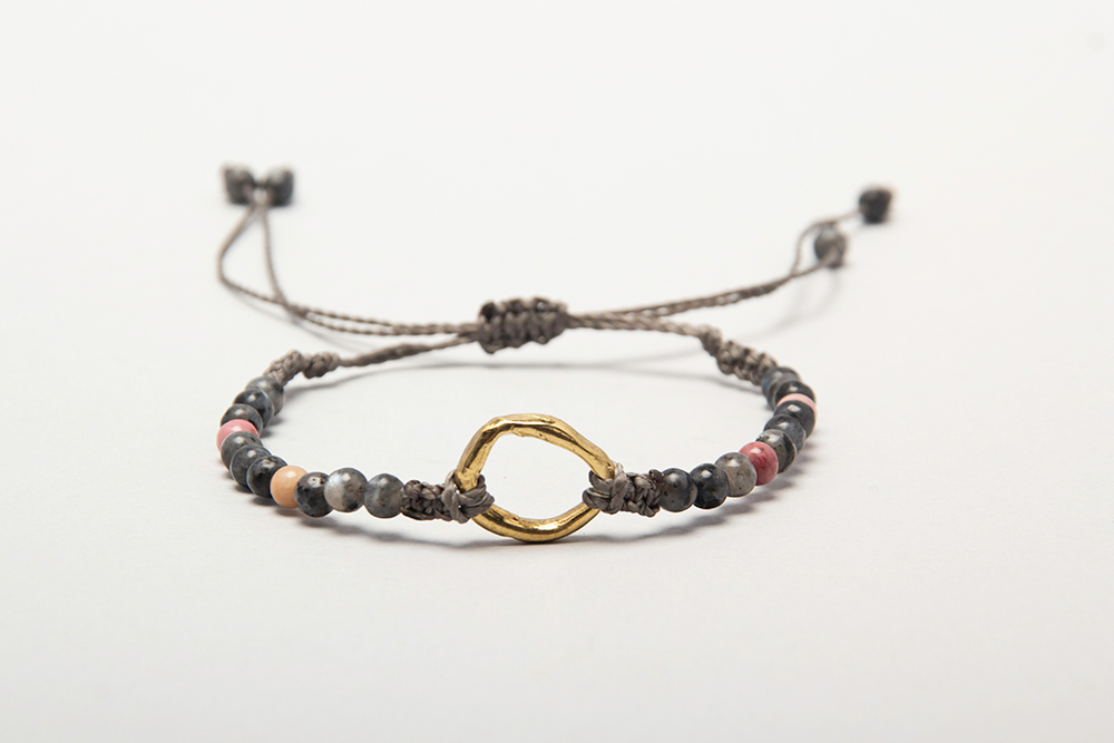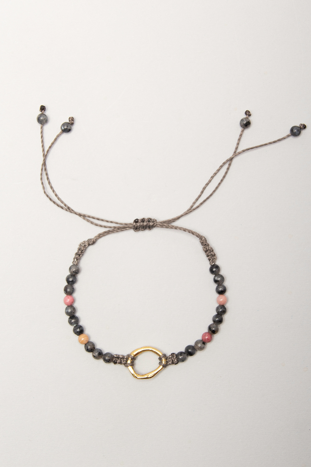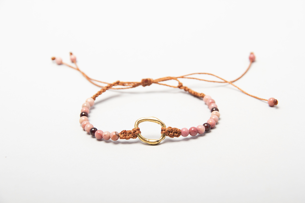 Pulsera tejida en macramé con piedras granate y rodolita/ojo de tigre/labradorita y rodolita con dije en bronce .
