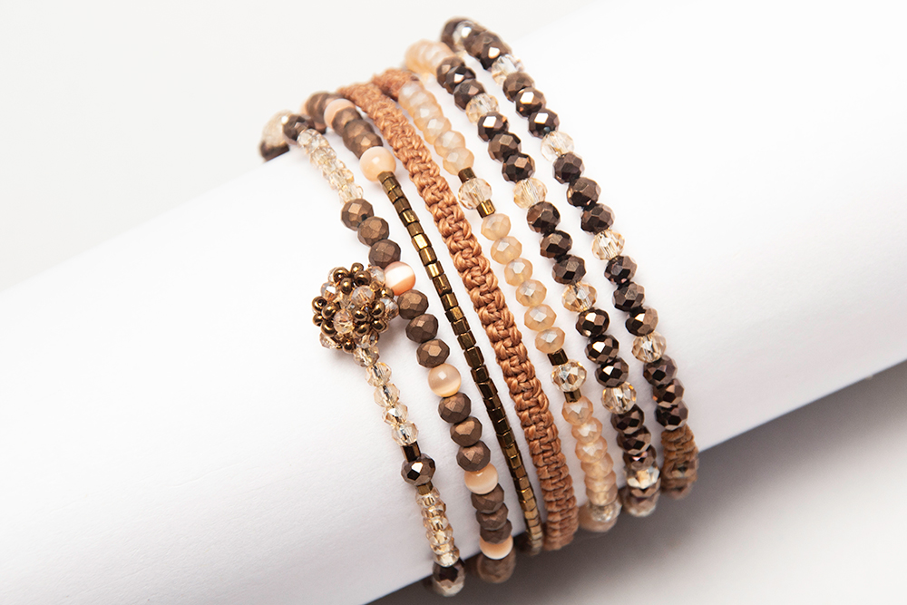 Esta pulsera rígida en cristales con macramé