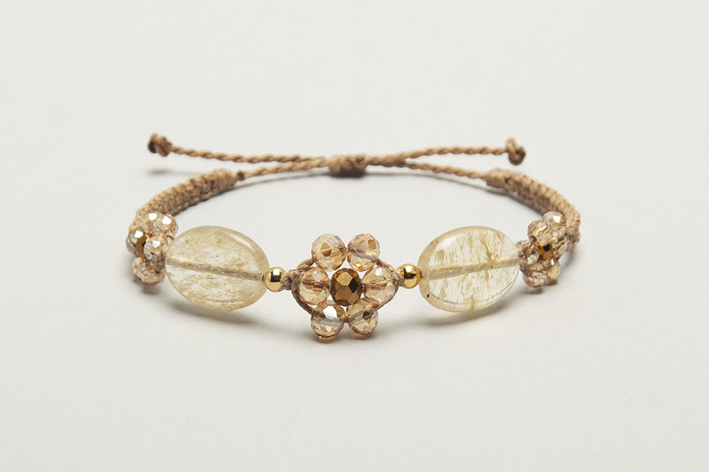 9)pulsera de quarzos y florcitas, con bolitas de acero bañadas en oro 24 k