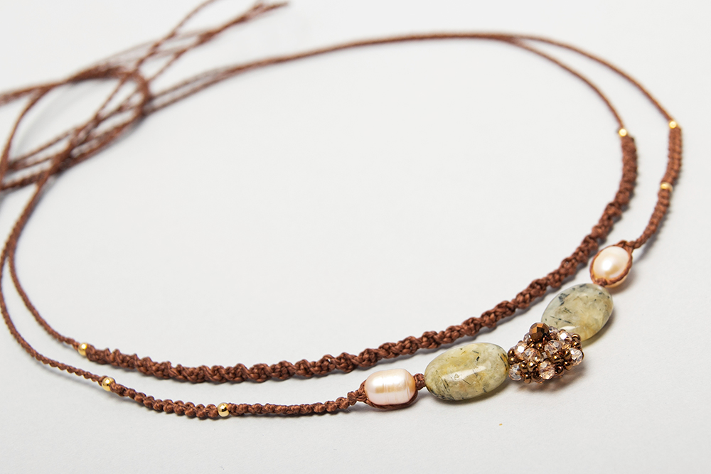 Collar doble, hecho en macramé con piedra jade, perlas de rio y cristales tejidos