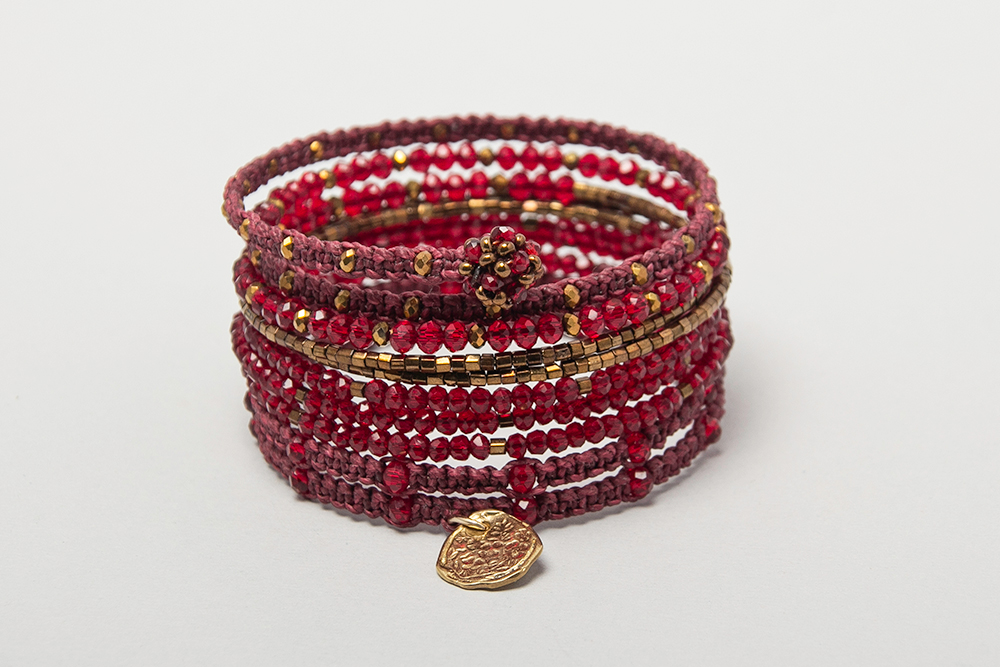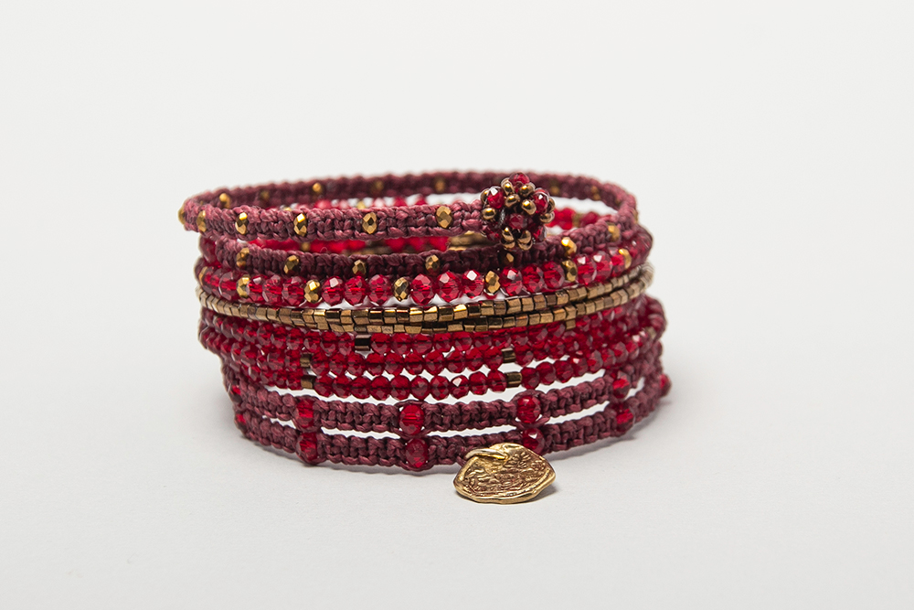 Pulsera rígida en cristales bordo, canutillos checos, detalles en macramé y dije en bronce.