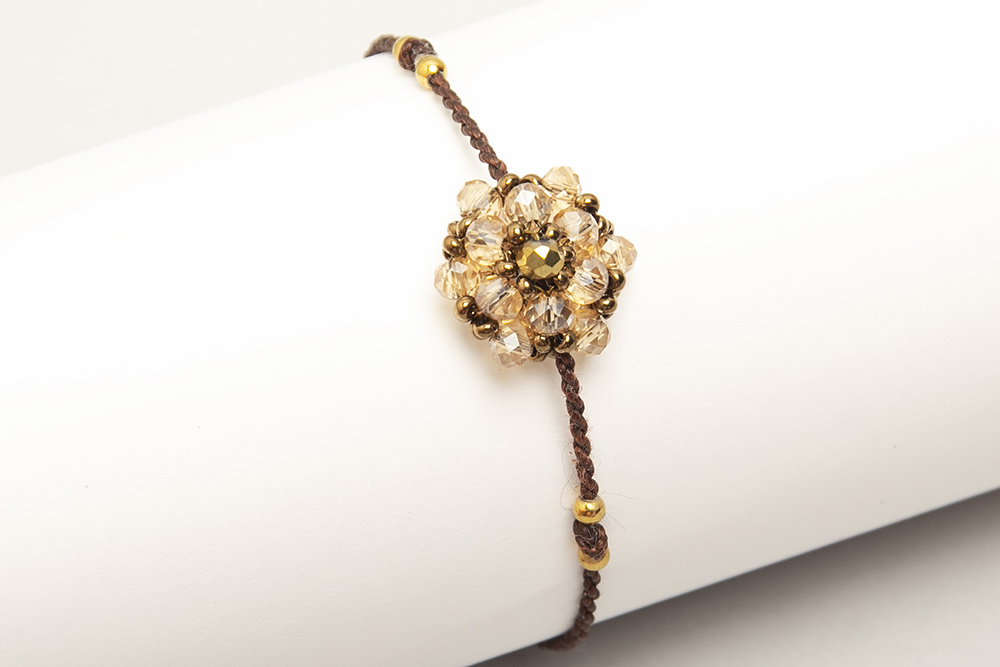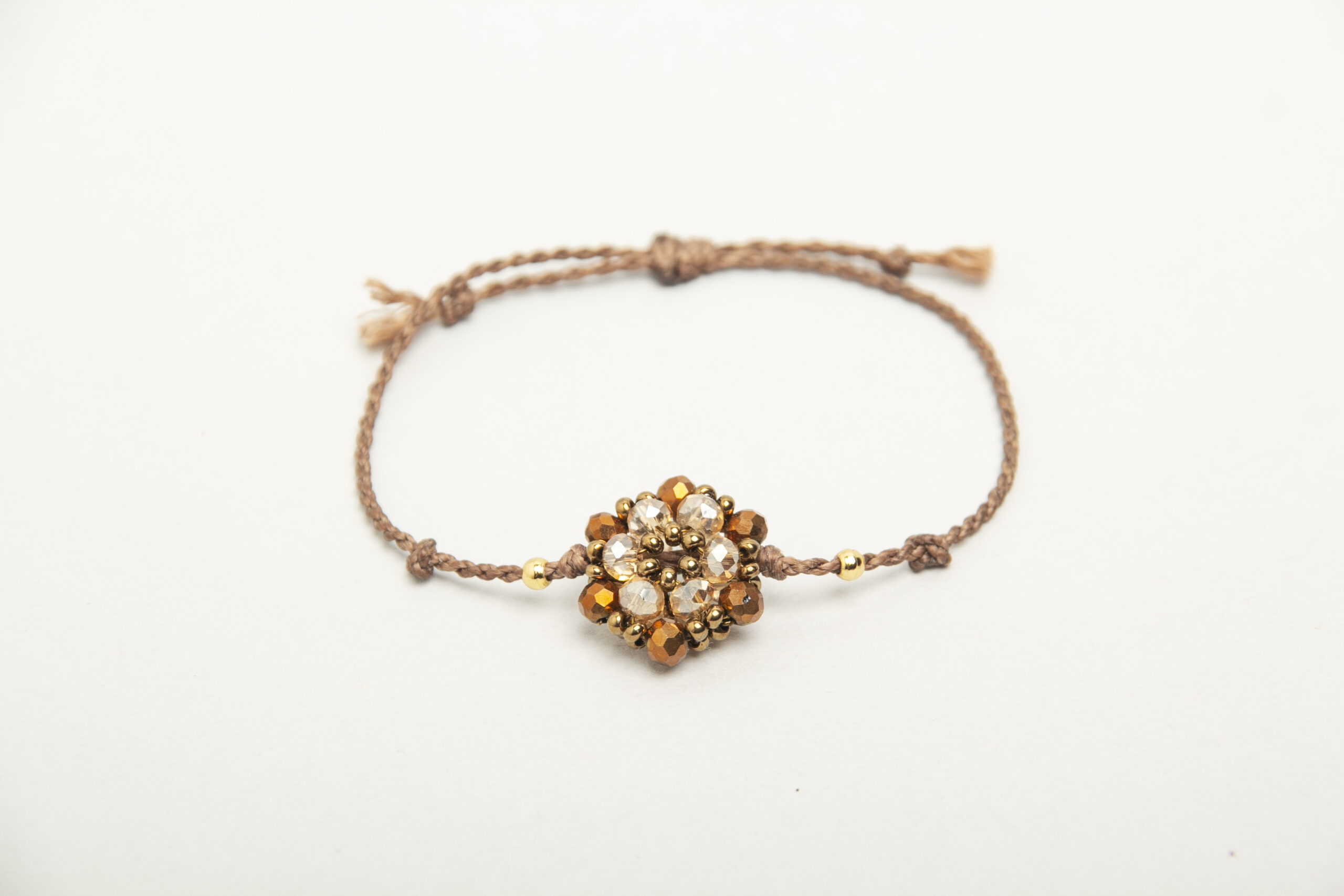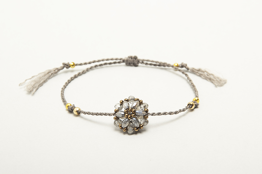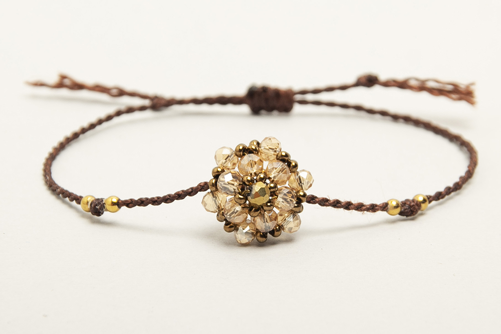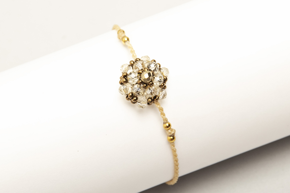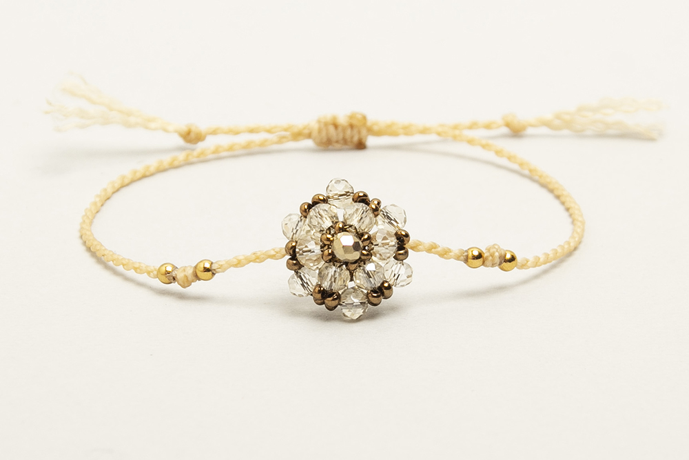 Pulsera hecha en macramé con cristales y bolitas de acero bañadas en oro 24 k.