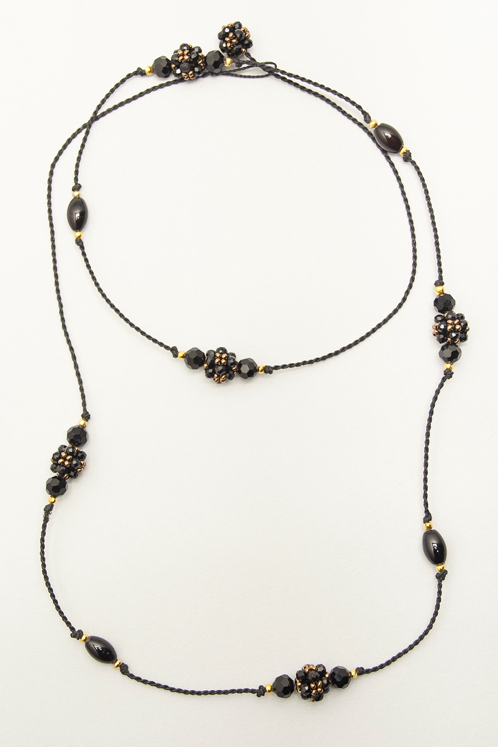 Collar largo hecho en macramé, con cristales tejidos, bolitas de acero bañadas en oro 24 k y piedras naturales. se puede usar largo o hacerle doble vuelta.