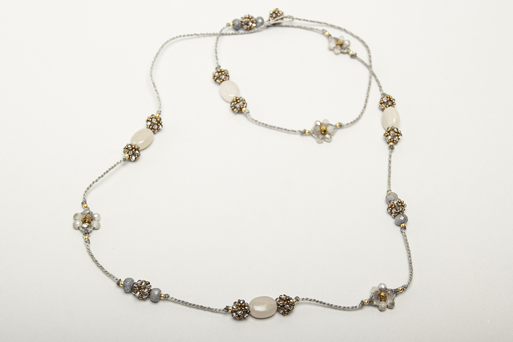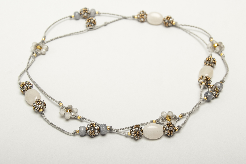 Collar en hilo encerado con piedras naturales , cristales tejido y bolitas de acero bañadas en oro 24 k