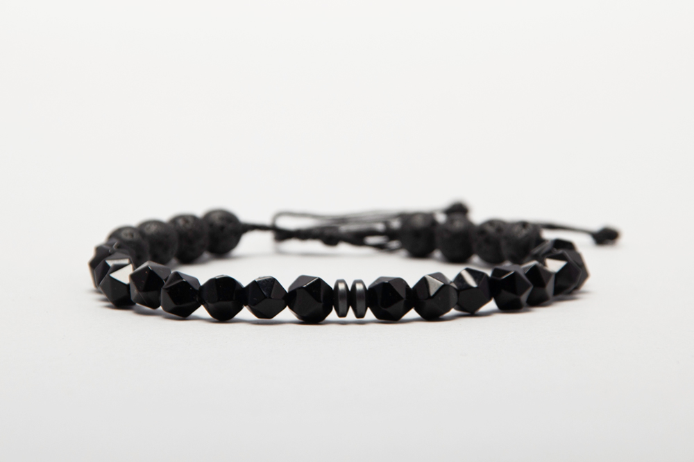 Pulsera en hilo encerado con cierre en macramé con piedras onix brilloso y piedras volcanicas