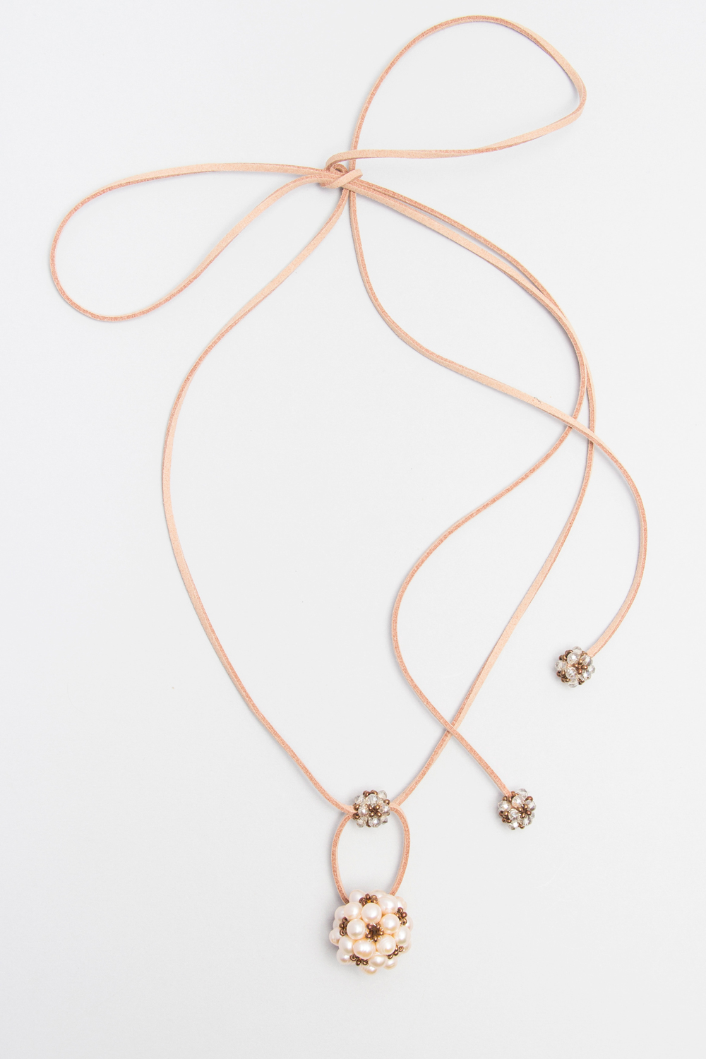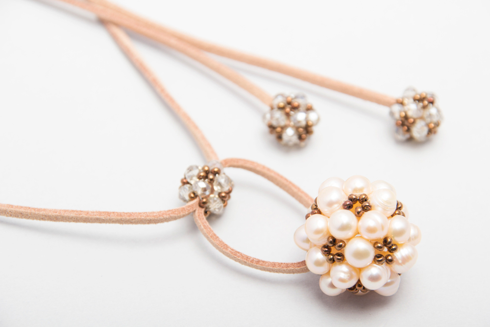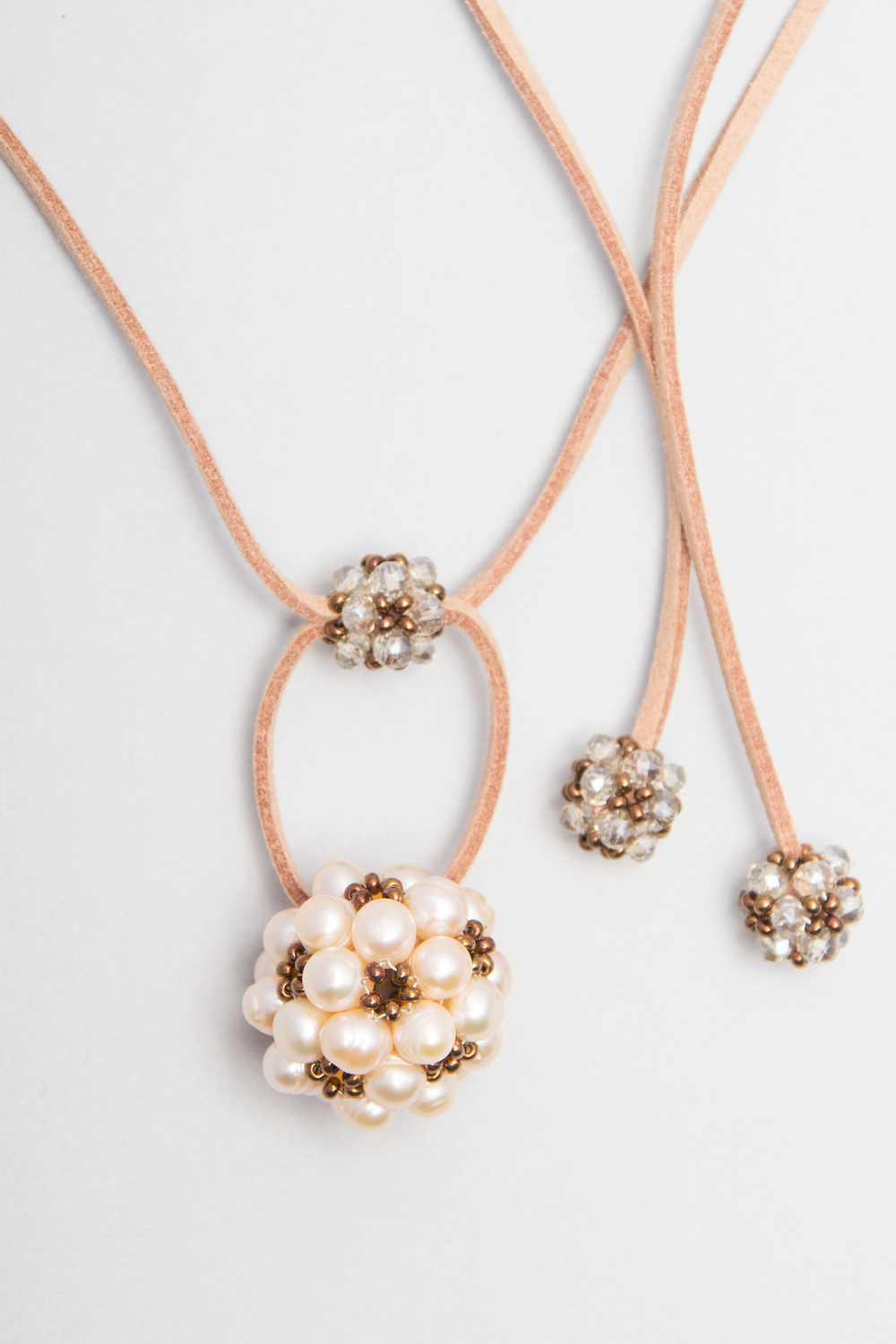 Collar de gamuza con bolita de perlas de rio y cristales checos.