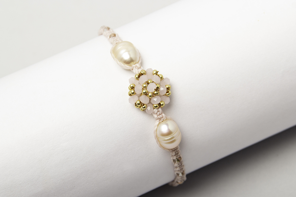 Pulsera hecha en macramé, con satélite central tejido en cristales y dos perlas d río cultivadas que lo envuelven.