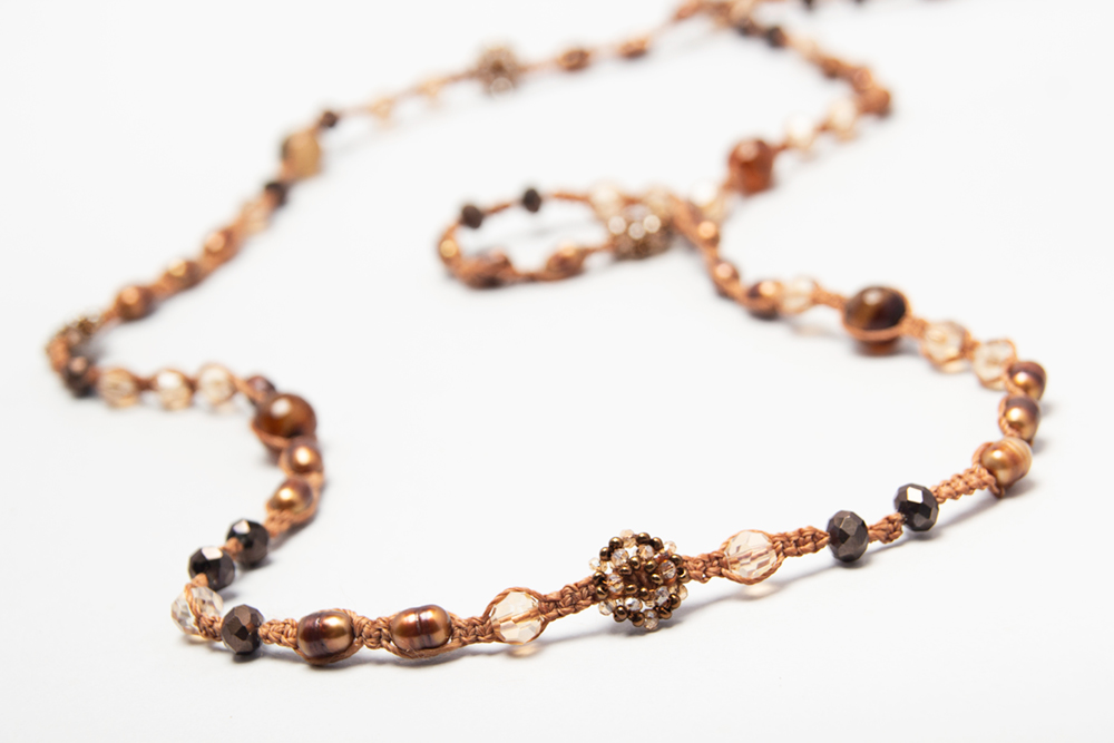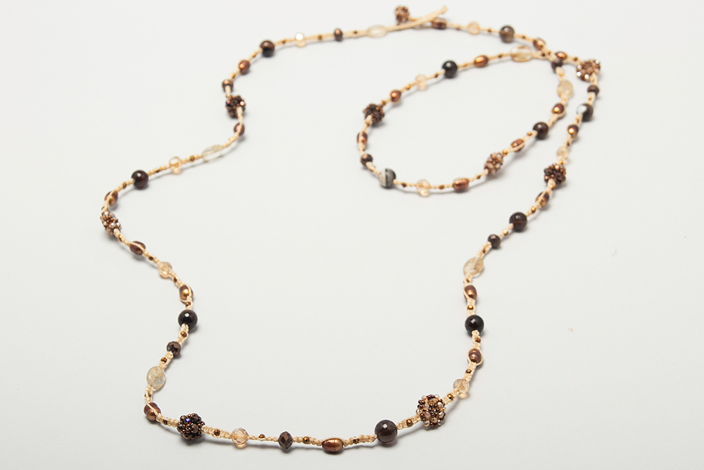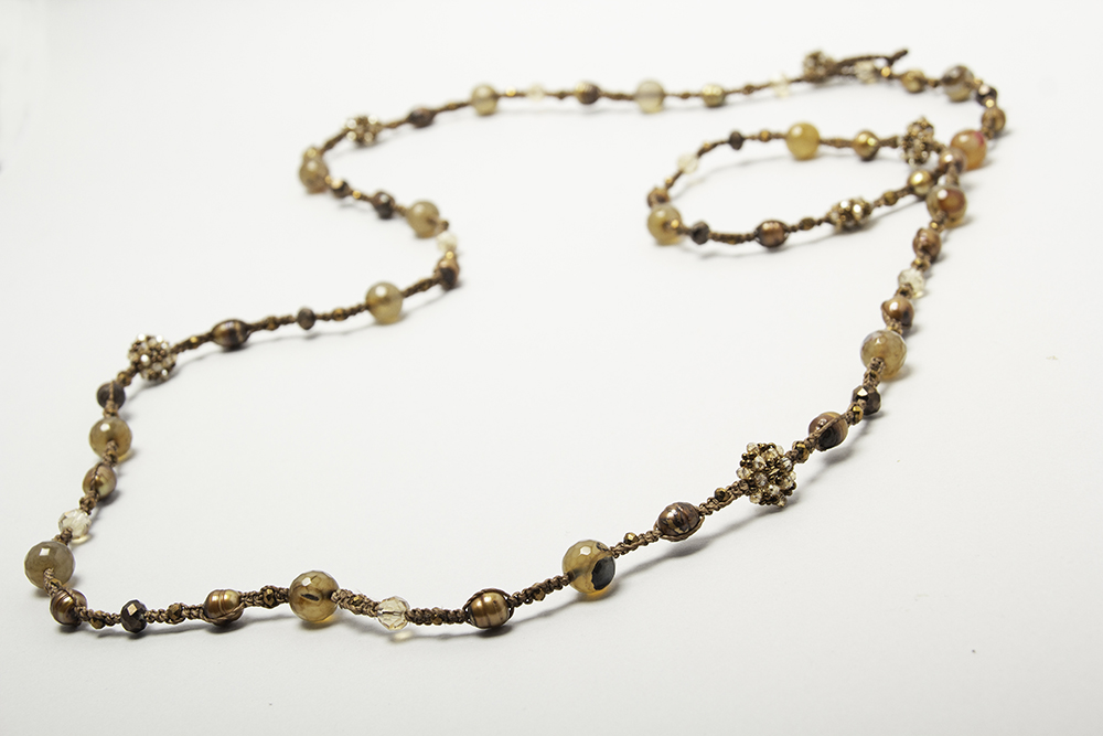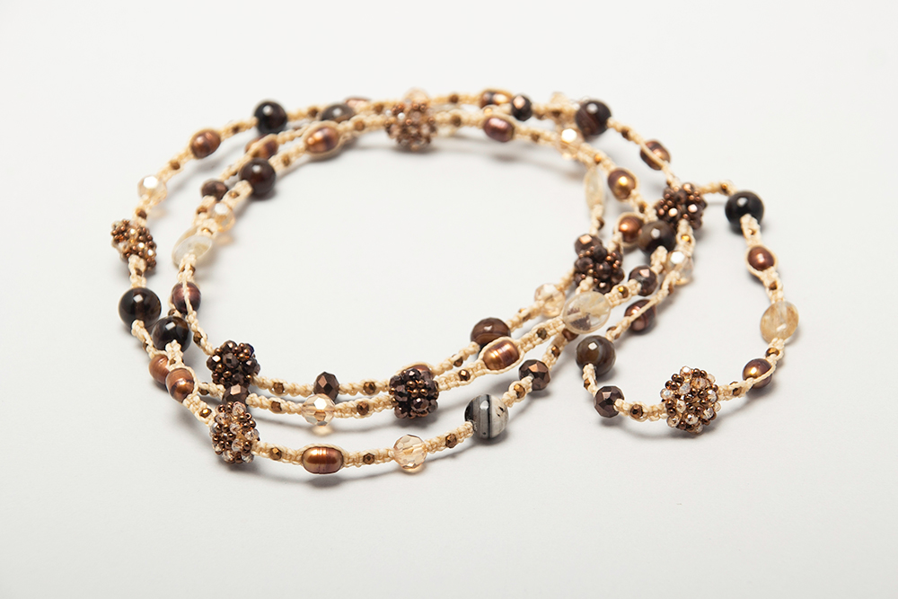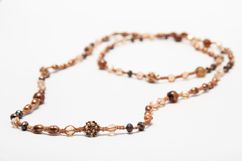 Collar largo hecho en macramé en tonos color chocolate, con perlas d río y quarzos facetados.