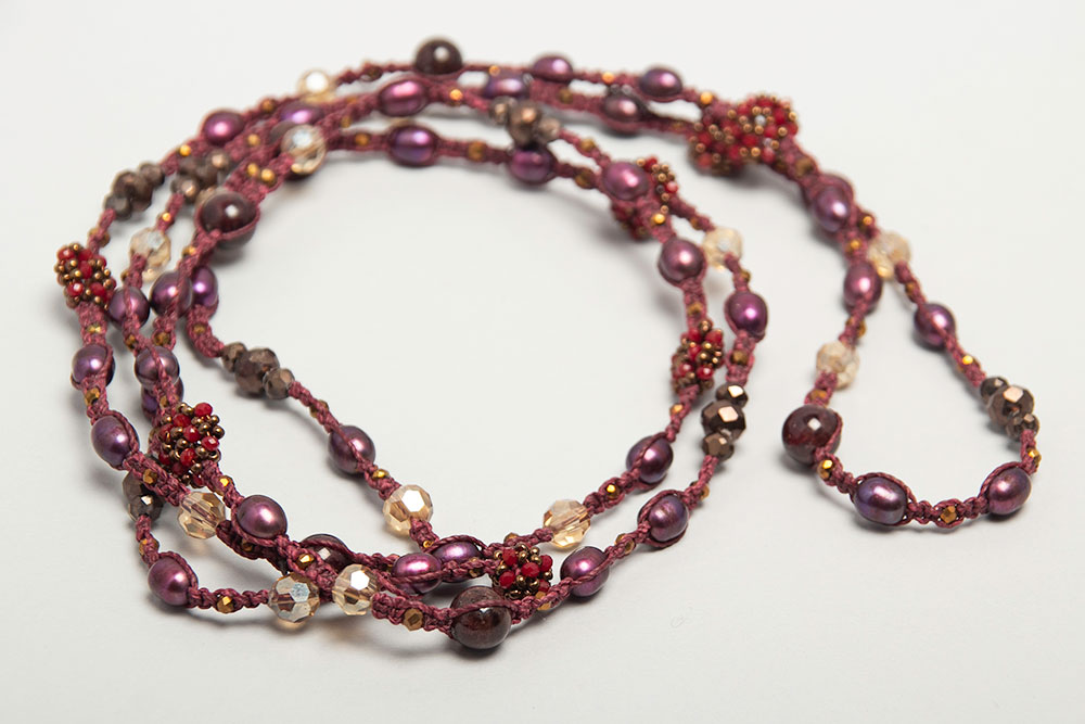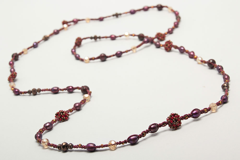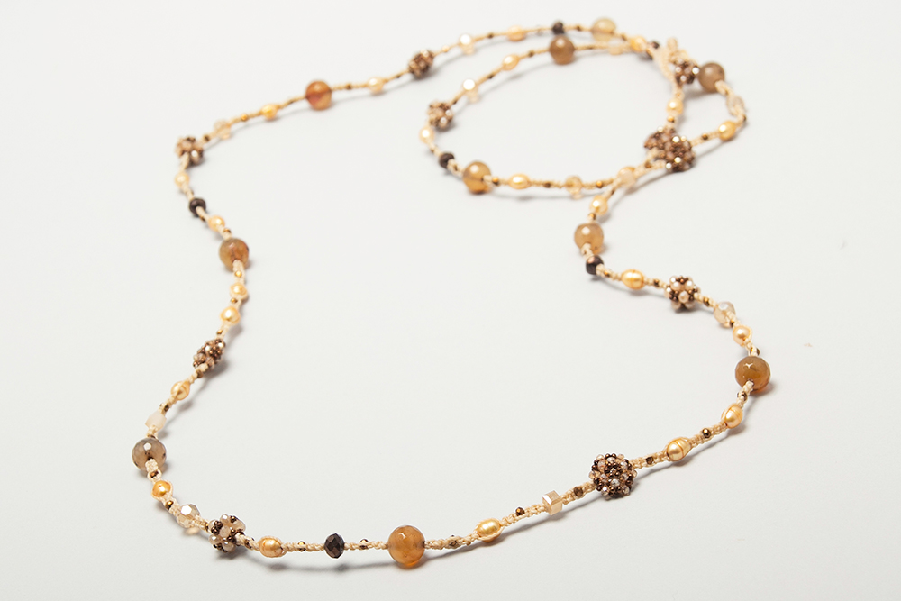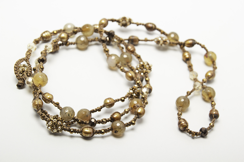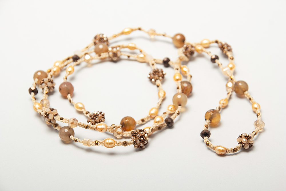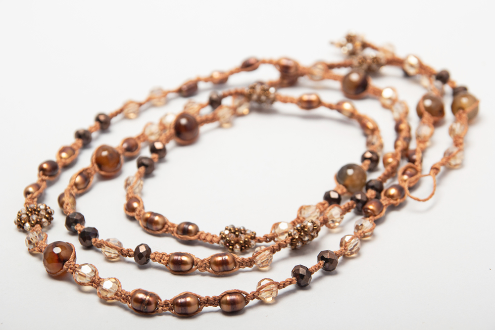 Collar largo hecho en macramé en tonos color chocolate, con perlas d río y quarzos facetados.