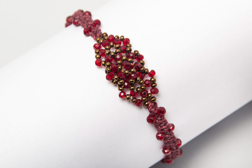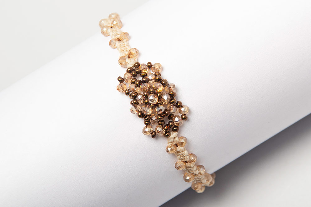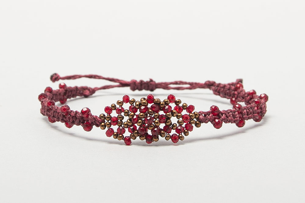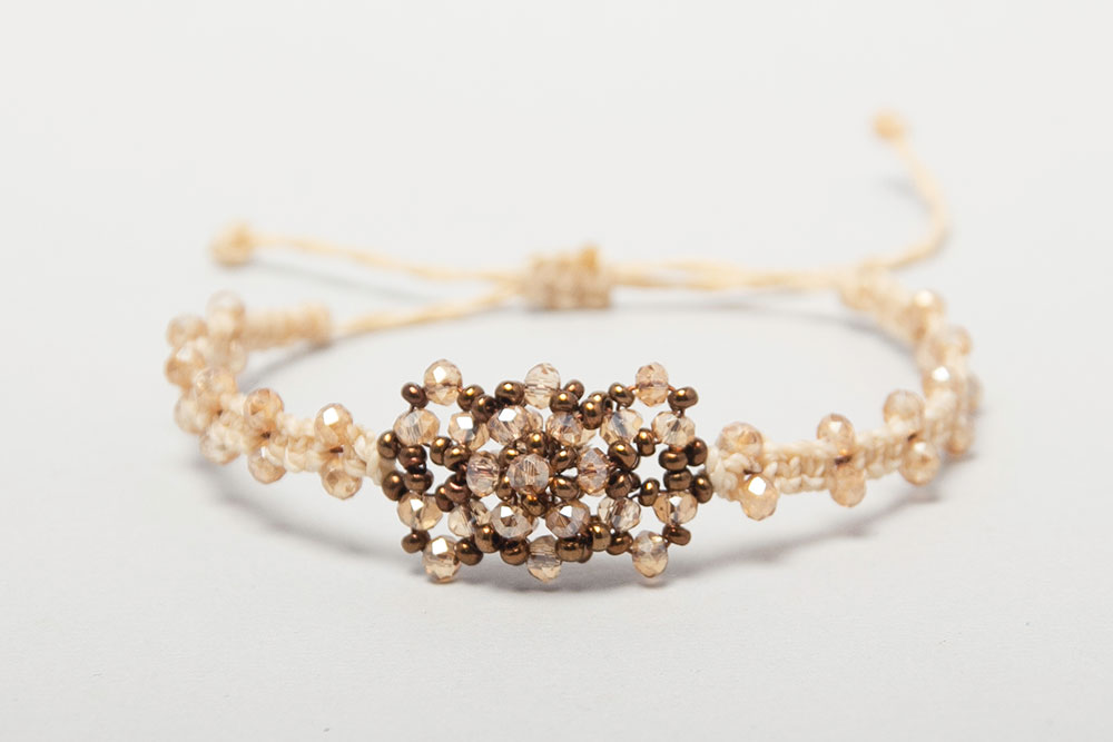 Pulsera con satélites centrales en cristales y macramé a los costados.