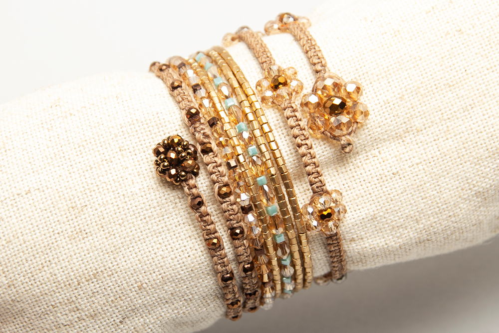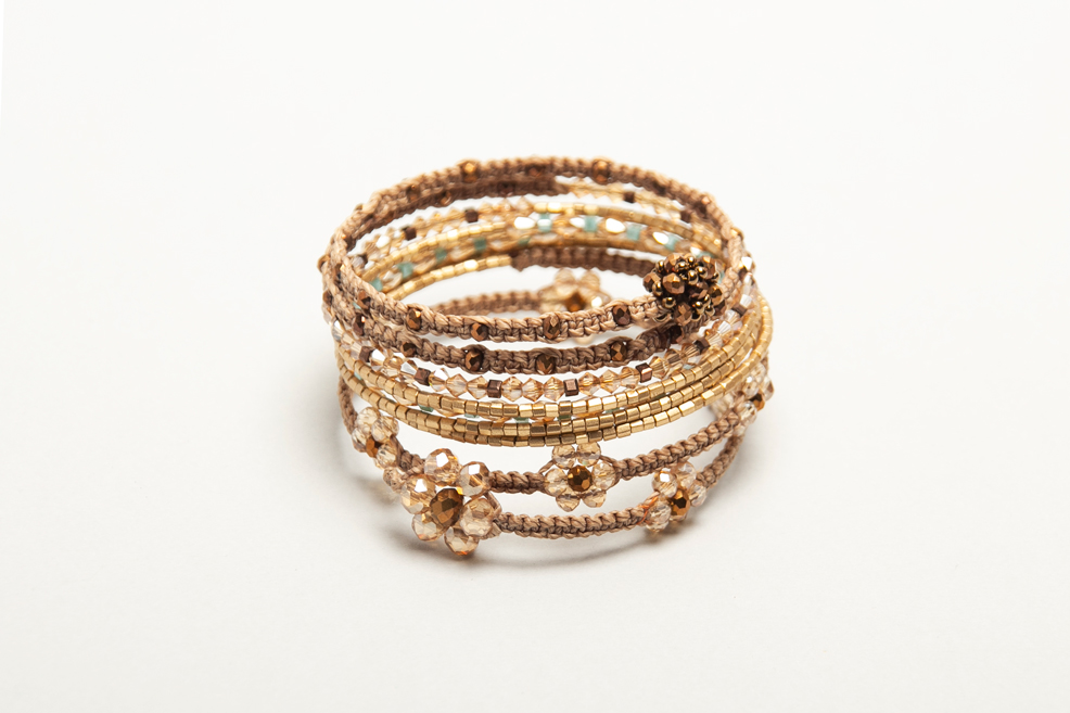 Pulsera rigida de varias vueltas con cristales especiales, canutillos checos y florcitas bordadas, hechas en macrame.