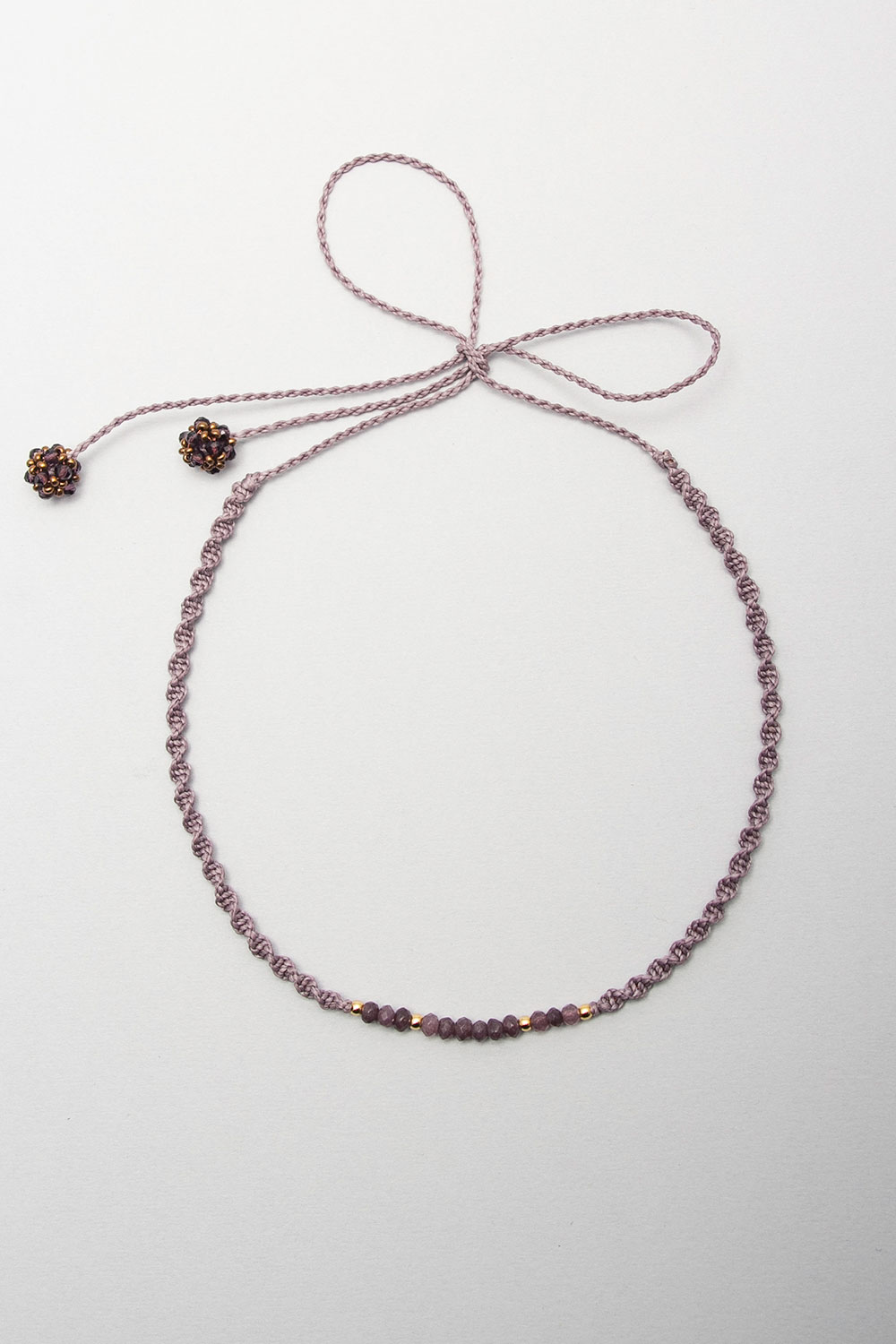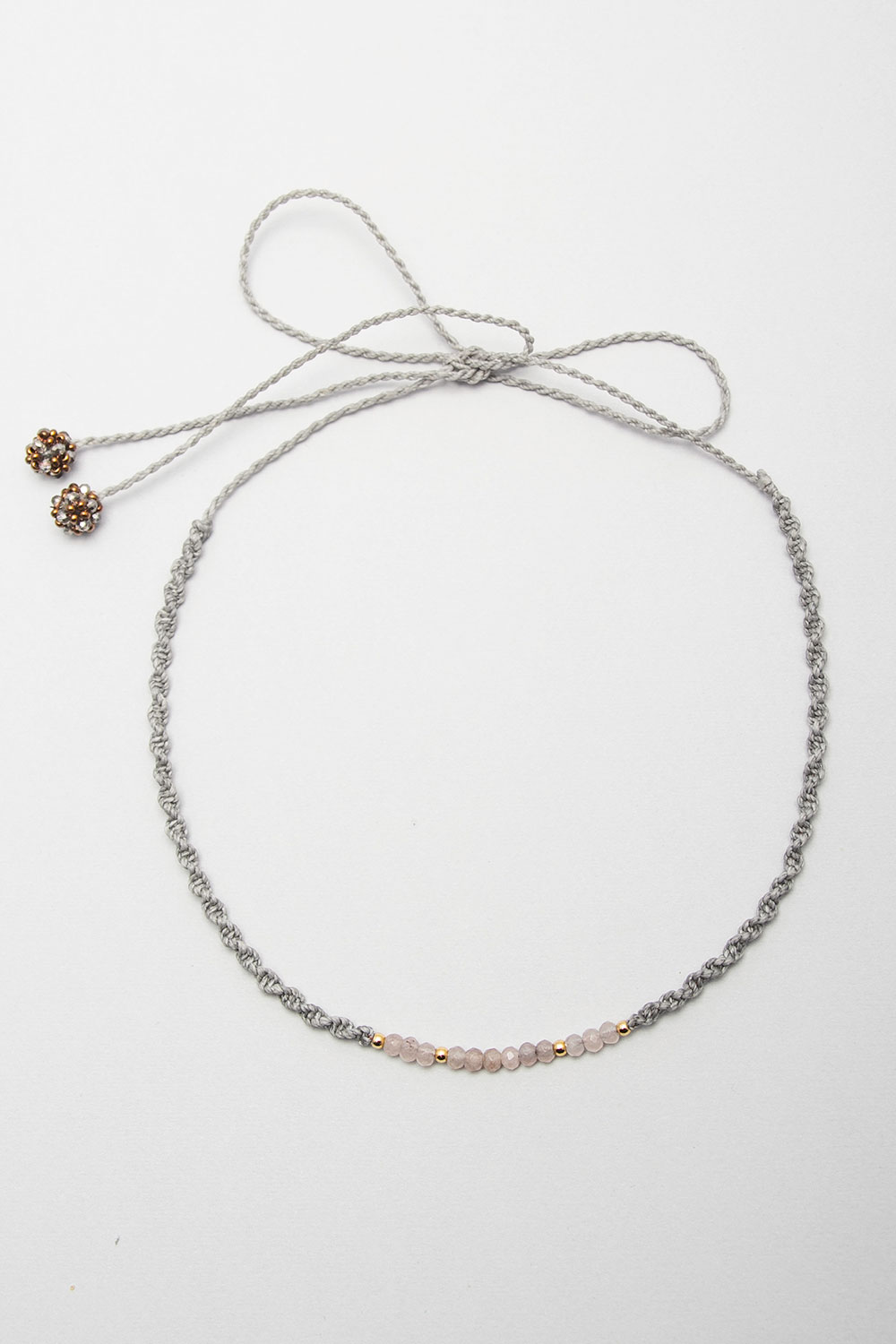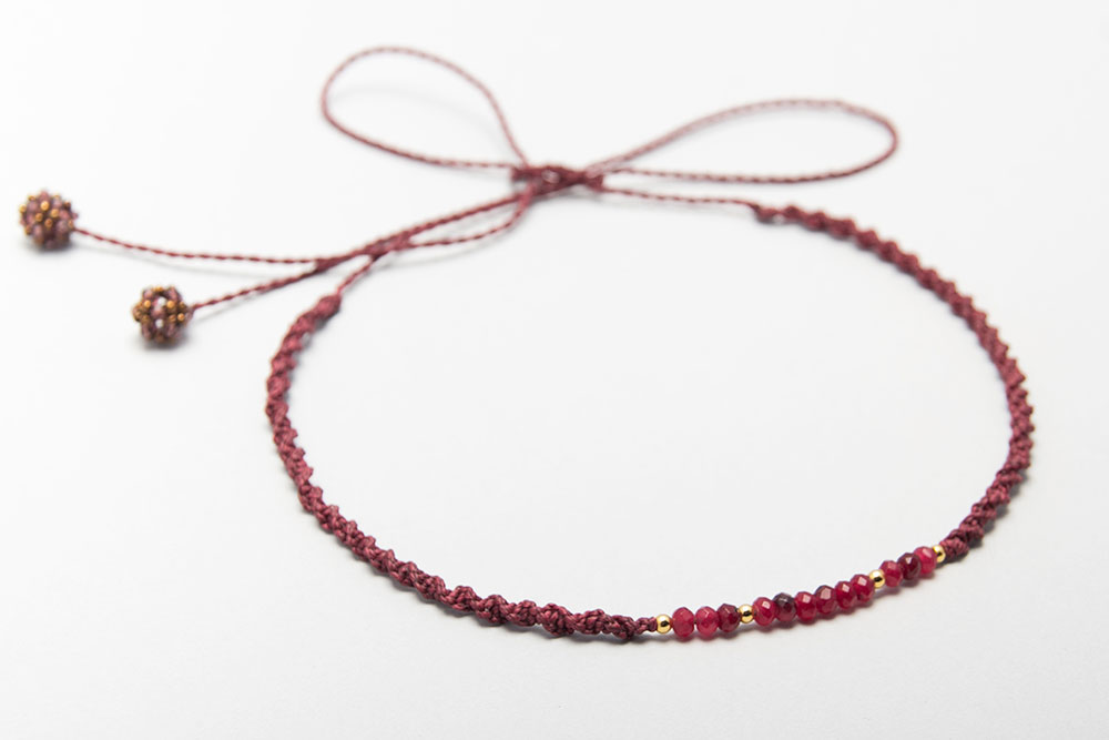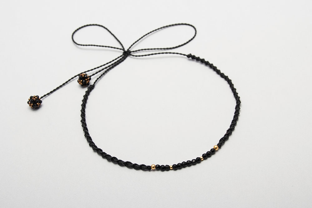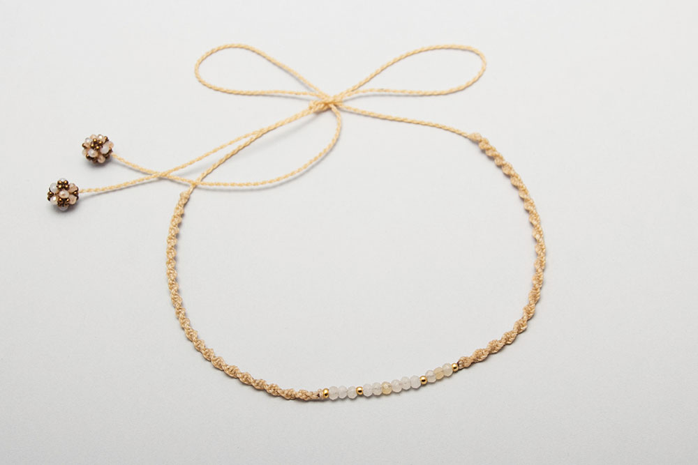 Gargantilla hecho en macramé con hilo encerado con donas de piedras naturales, divinas y pelotitas de acero bañanas en oro 18k.