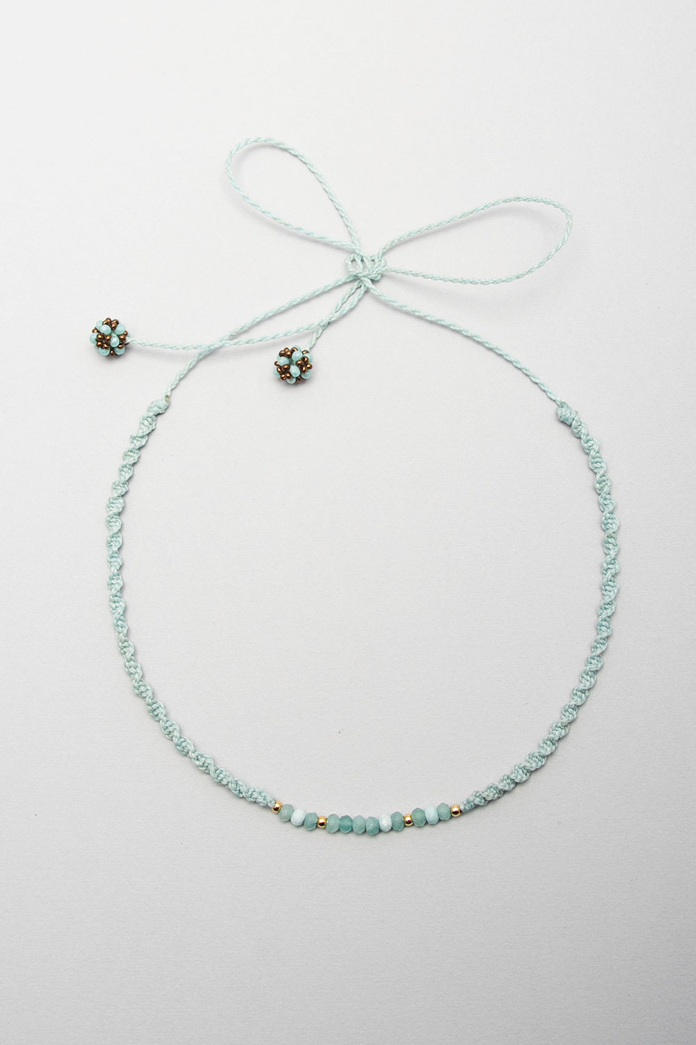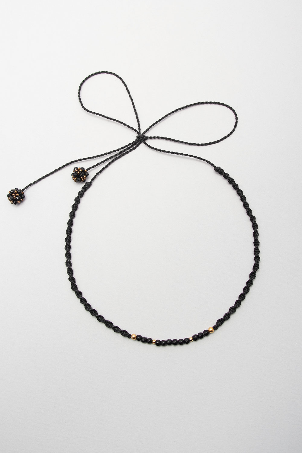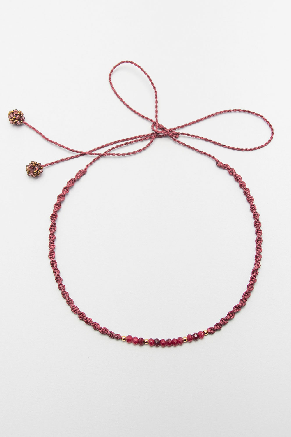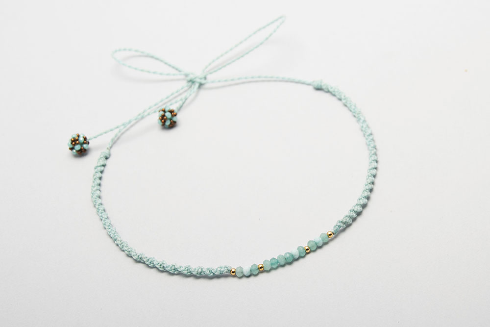 Gargantilla hecho en macramé con hilo encerado con donas de piedras naturales, divinas y pelotitas de acero bañanas en oro 18k.