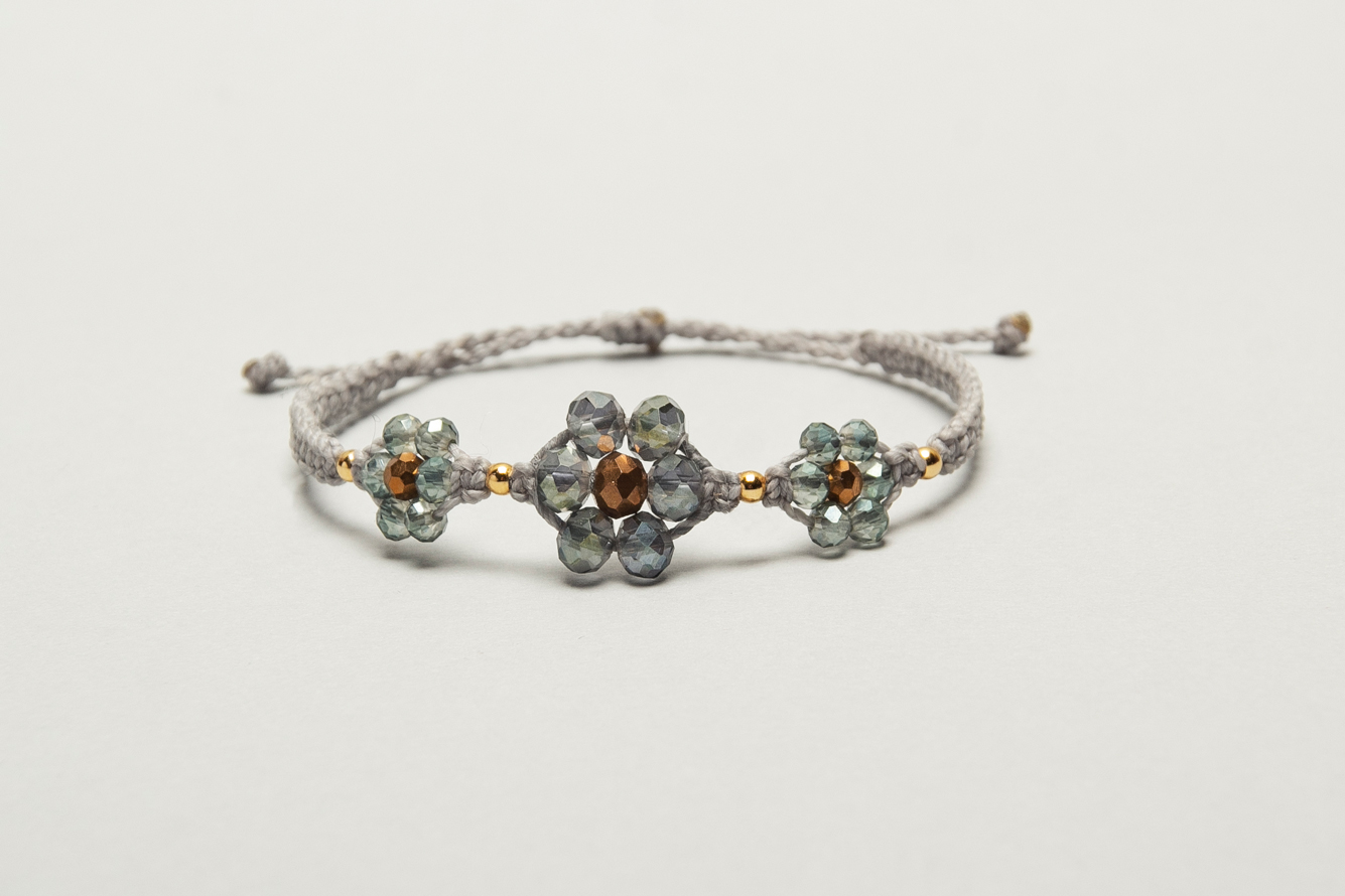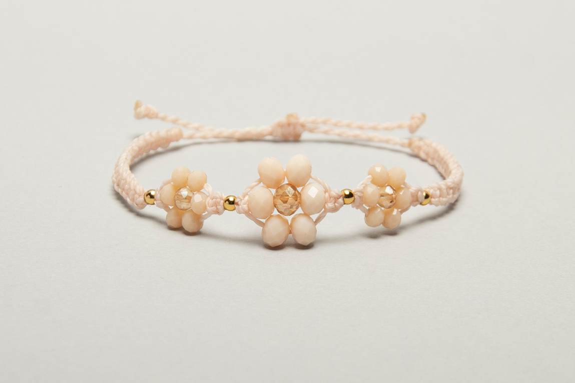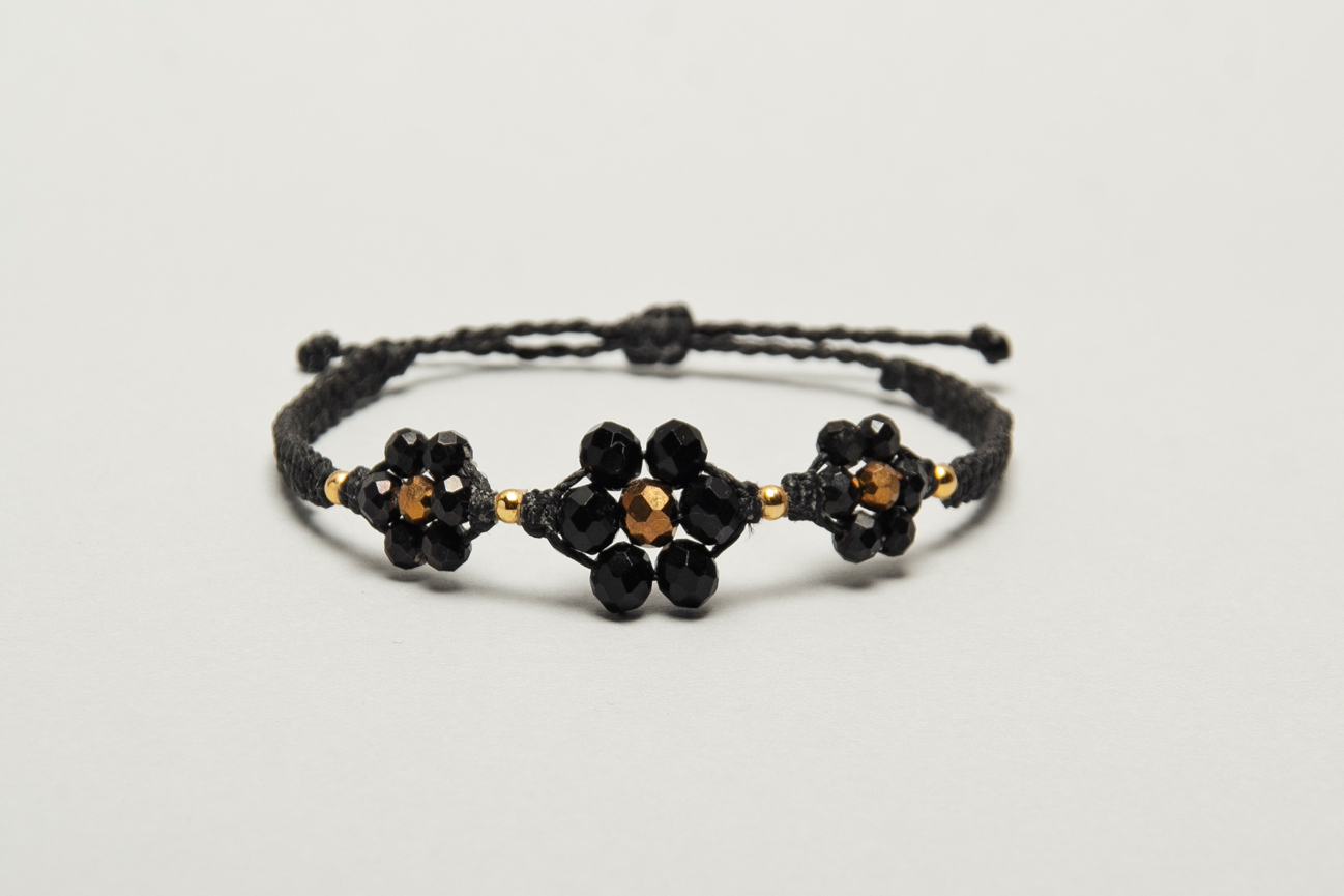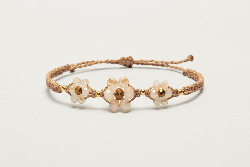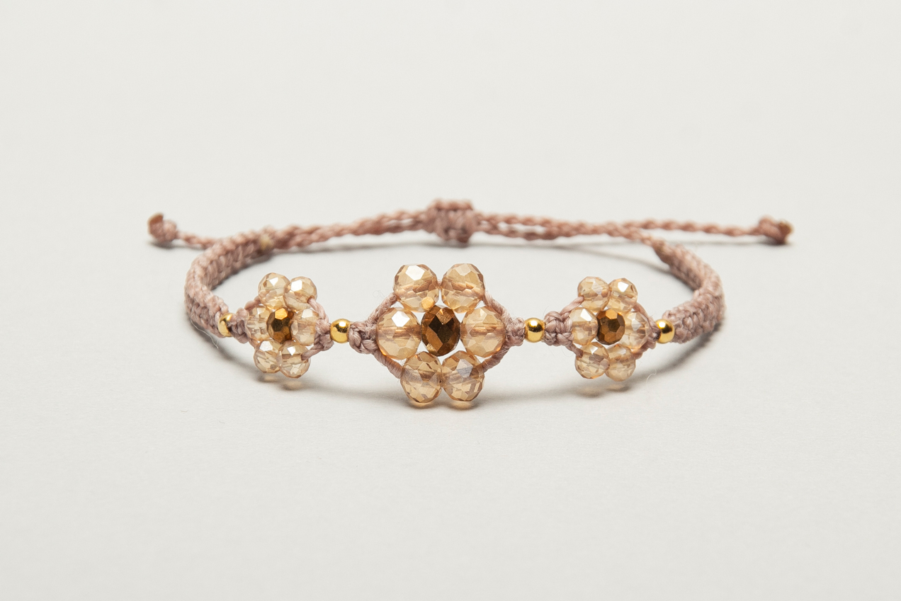 Pulseras de florcitas hechas en macrame con hilo encerado, cristales y bolitas de acero bañadas en oro 24 k