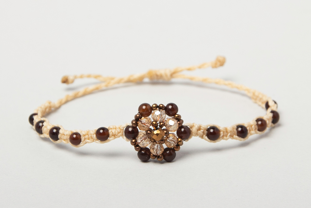 Pulsera bordada en macramé con satélite en cristales y quarzos fume
