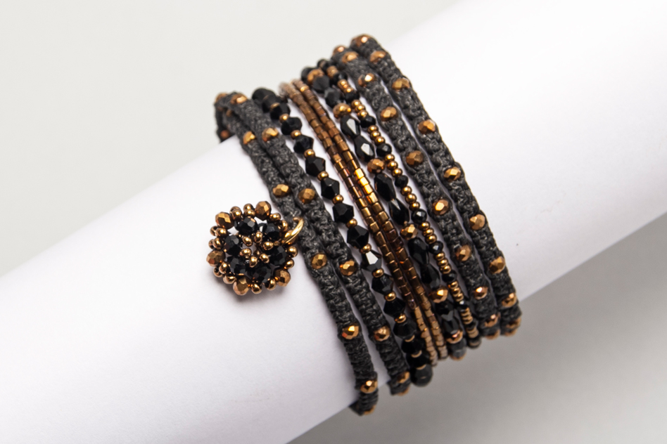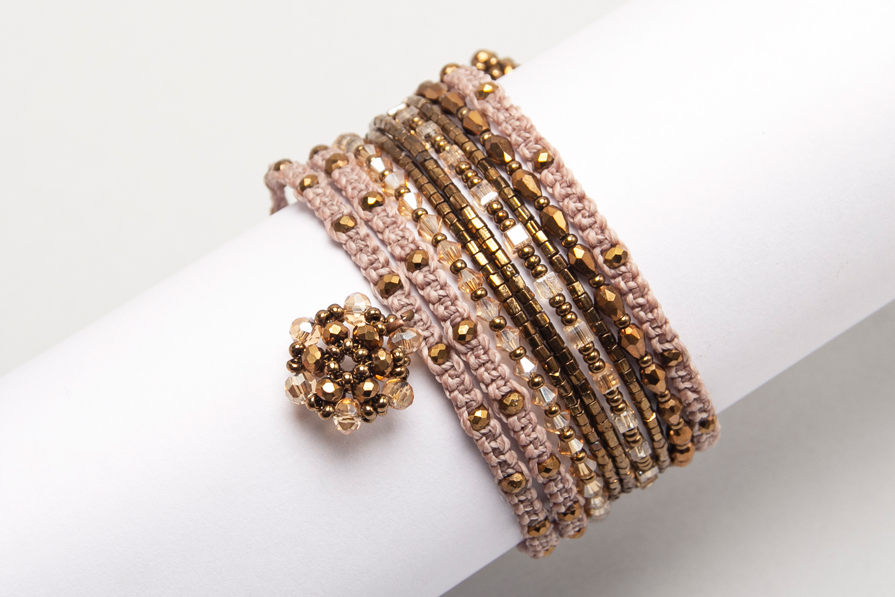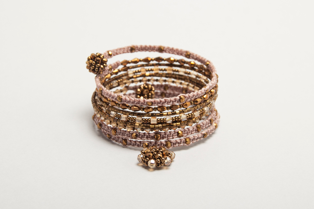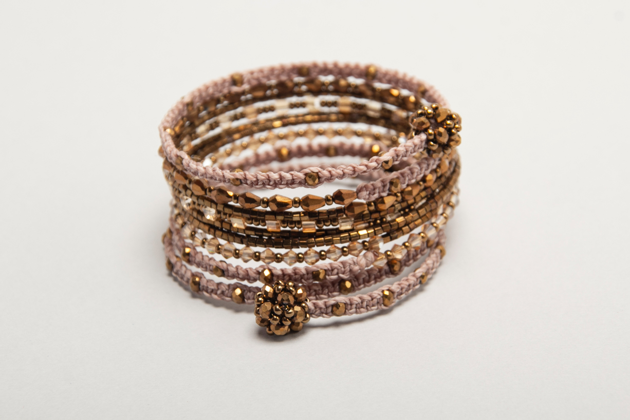 Pulsera rigida con cristales y canutillos checos, bordada en macrame.
