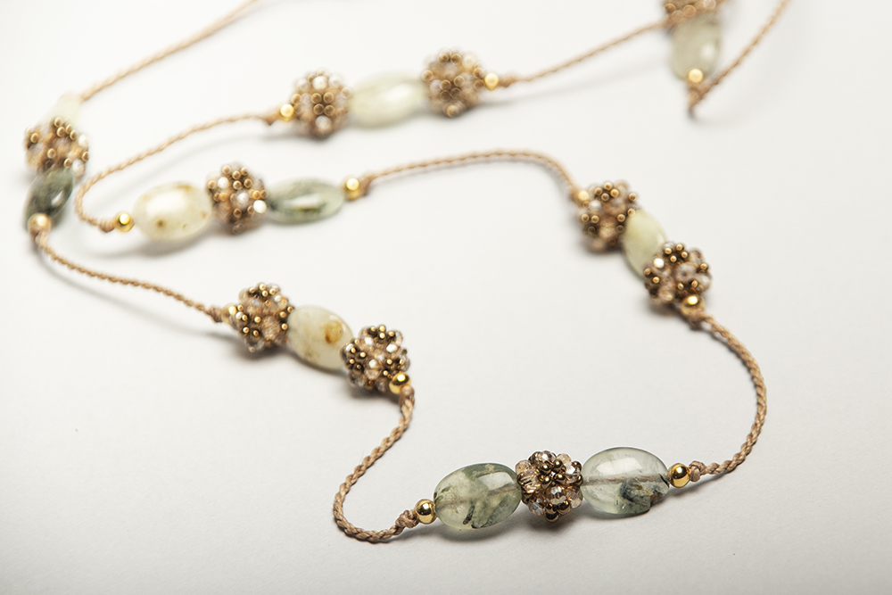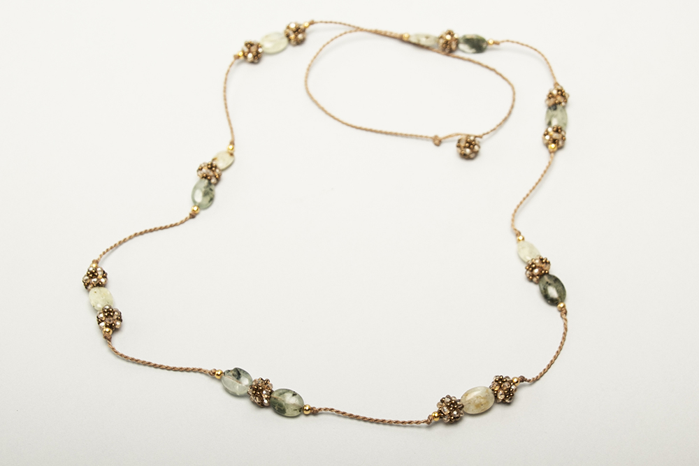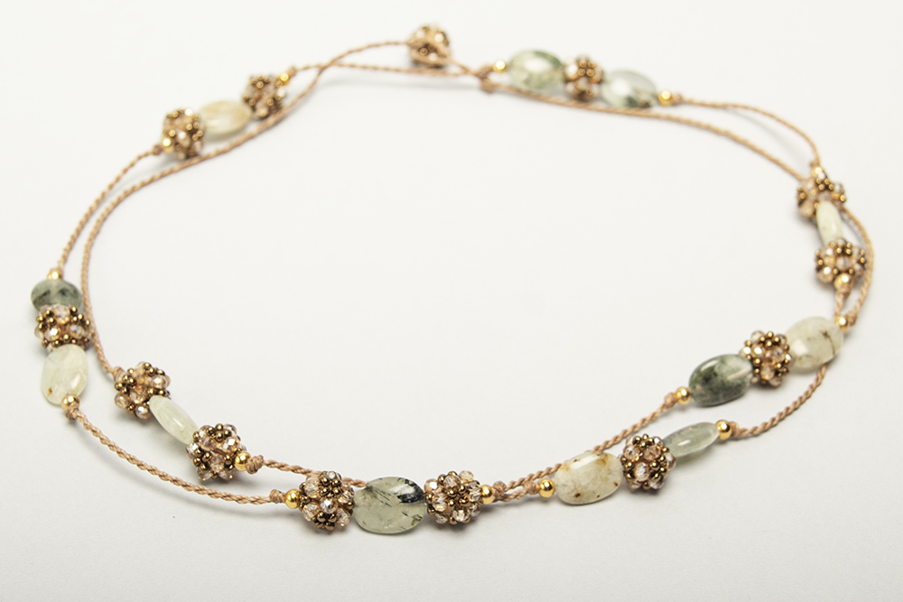 Collar de hilo encerado trabajado, piedras jade, cristales tejidos y bolitas de acero bañadas en oro 24 k